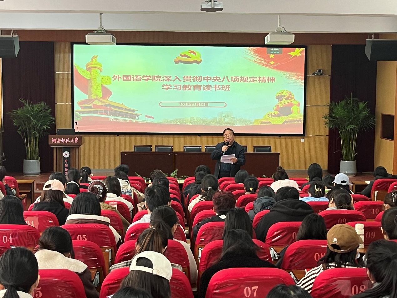 3月27-28日,外国语学院开展深入贯彻中央八项规定精神学习教育读书班。读书班以专家辅导、个人自学、集体学习和交流研讨的形式进行。3月28日下午,学院于院报告厅召开深入贯彻中央八项规定精神学习教育读书班集体学习和交流研讨会。会议由院党委书记赵成福主持。
