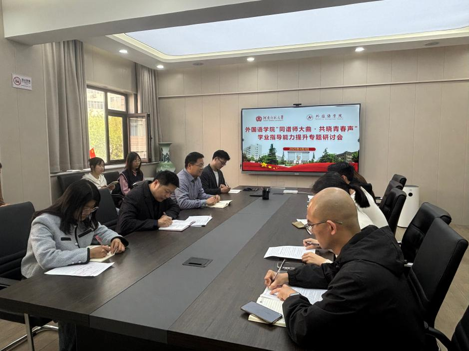 为深入贯彻落实学校学工队伍学业指导能力提升专题培训会议精神构建协同育人长效机制,4月3日下午,外国语学院在学院会议室召开同谱师大曲・共晓青春声学业指导能力提升专题研讨会学院相关负责人、全体专兼职辅导员及部分教师和学生代表参会,会议由学院党委副书记曹崇主持