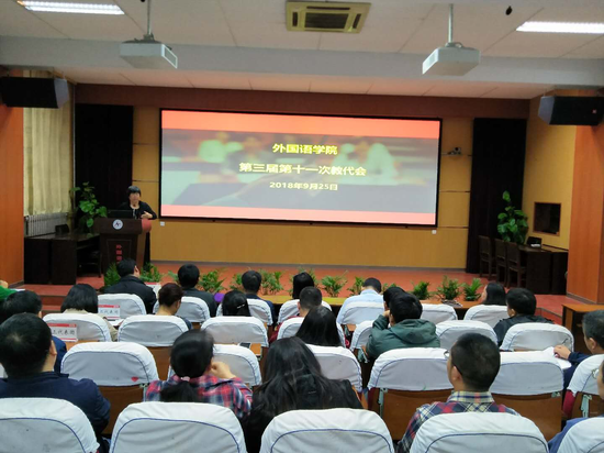 9月25日下午,外国语学院第三届第十一次教代会在学院报告厅举行。本次会议应到代表31名,实到23名,请假8名,符合法定人数。会议由院工会副主席王晔主持。
