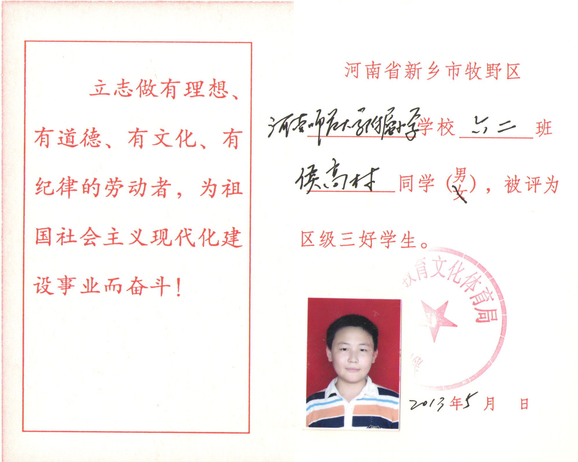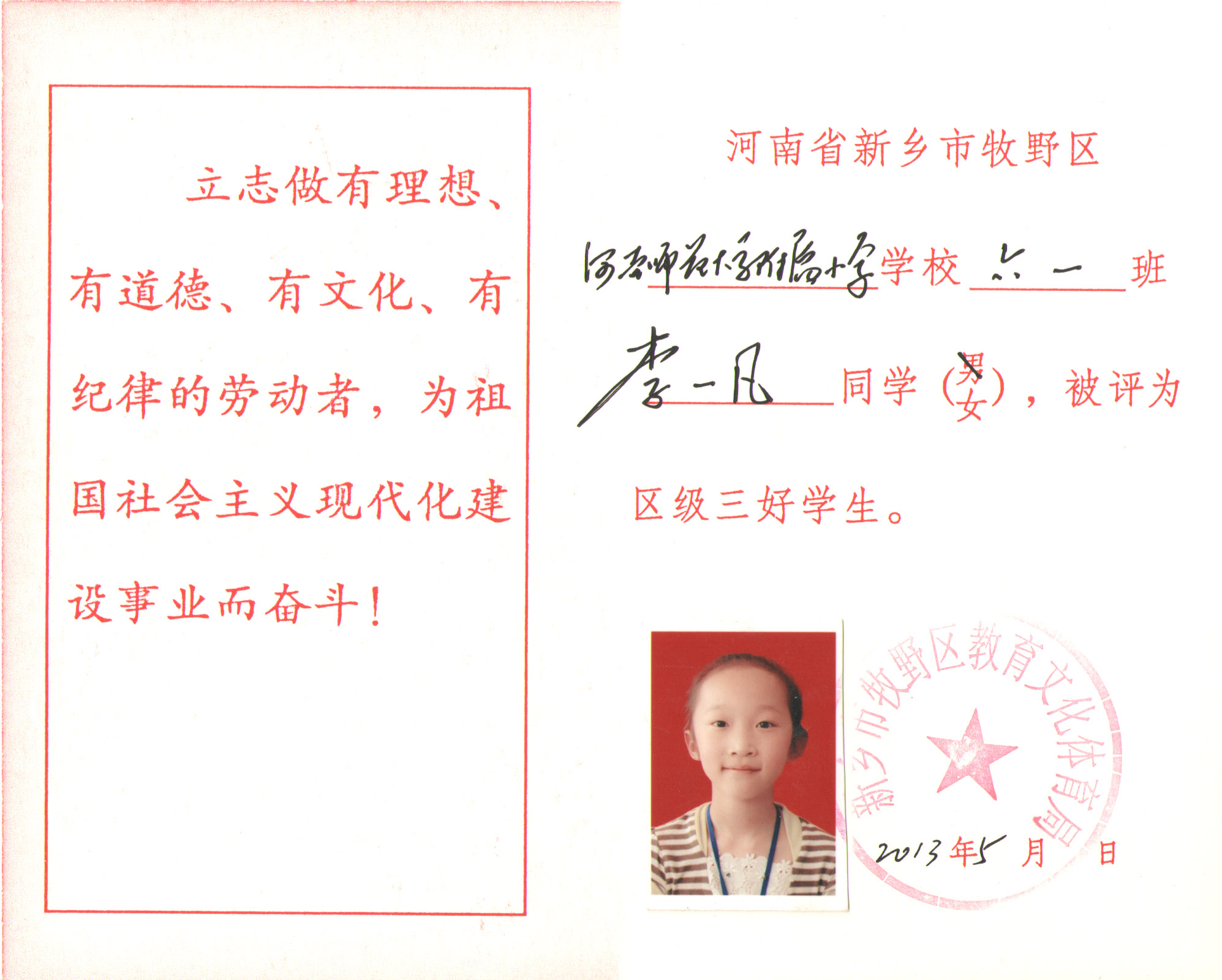 魏艺萌等6位同学被评为“牧野区三好学生”