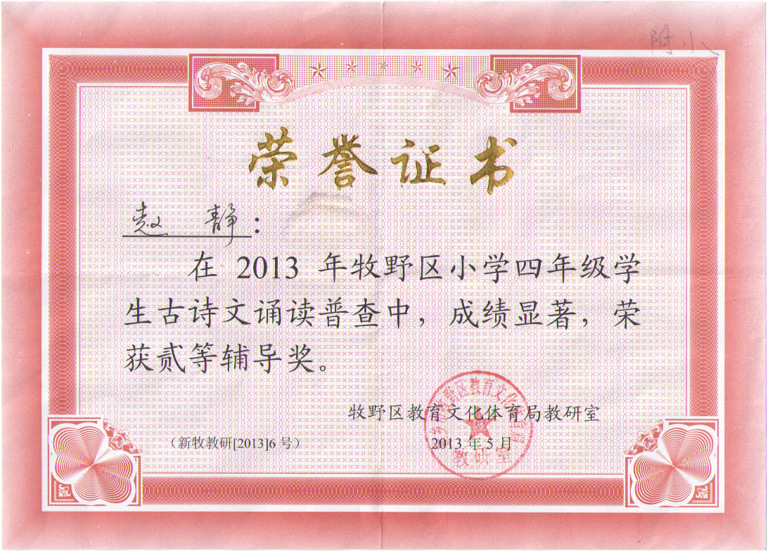 在牧野区小学四年级学生古诗文诵读普查活动中,四年级学生成绩显著,获牧野区第5名的好成绩(二等奖第一名)。赵静老师获辅导教师奖。