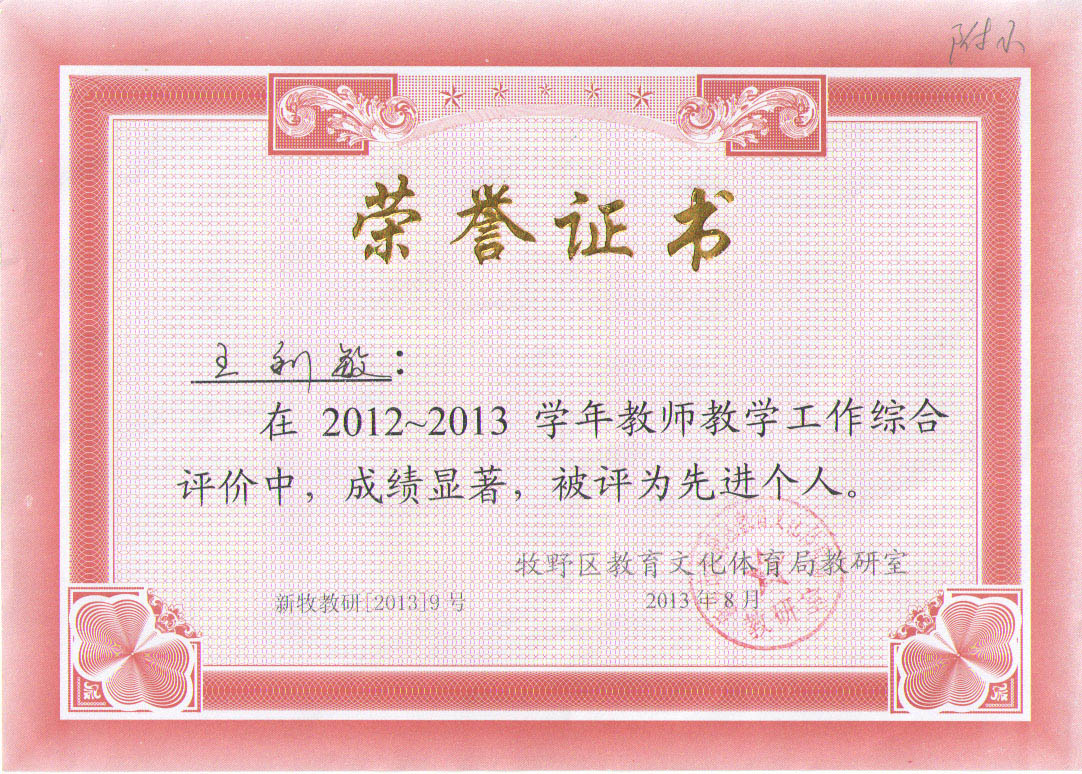2013年9月,在牧野区教育文化体育局开展的2012-2013学年“教师教学工作综合评价”活动中,王秀凤、王利敏两位老师成绩突出,被评为 “先进个人”。