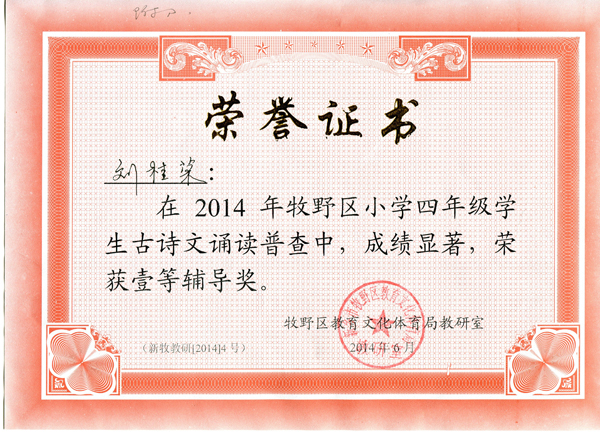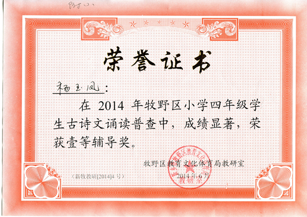 杨玉凤、刘桂荣老师荣获牧野区一等辅导奖