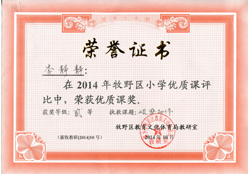 在牧野区2014年小学优质课评比活动中,我校赵金红老师执教的语文课《圆圆的沙粒》获得一等奖,并将代表牧野区参加市优质课比赛;李静静老师执教的数学课《观察物体》获得二等奖。
