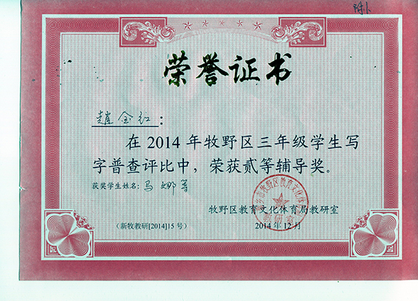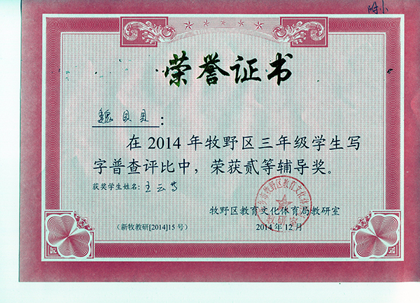 我校赵金红老师、魏贝贝老师荣获牧野区学生写字普查辅导奖