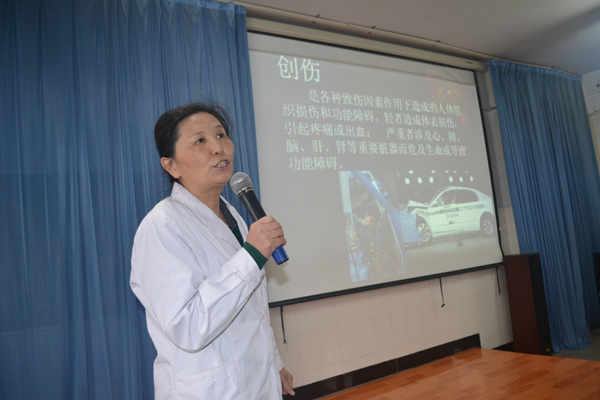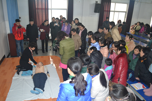 启动仪式之后,对急救员进行了培训。首先进行理论知识培训,救护新理念、心肺复苏术、常见急症等知识由河师大社区卫生服务中心护理部主任曹艳萍讲解,创伤救护、突发事件和意外伤害等部分由河师大社区卫生服务中心医务科科长刘建讲解。两位专家的报告有理论知识,有案例分析,形象直观,通俗易懂。