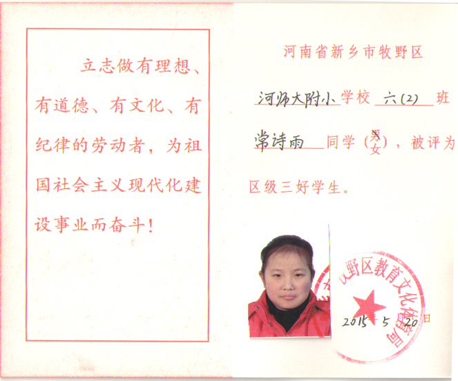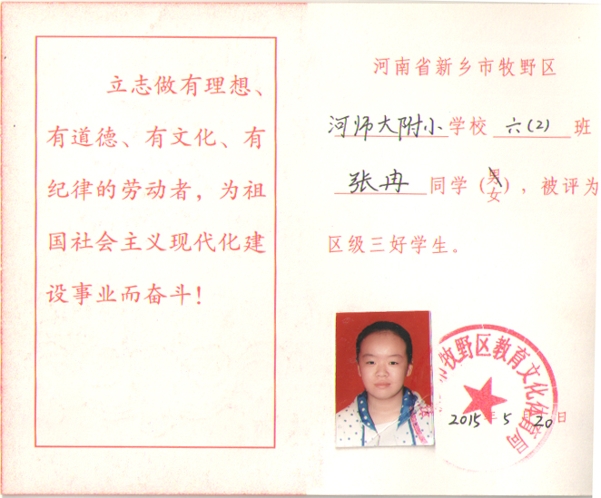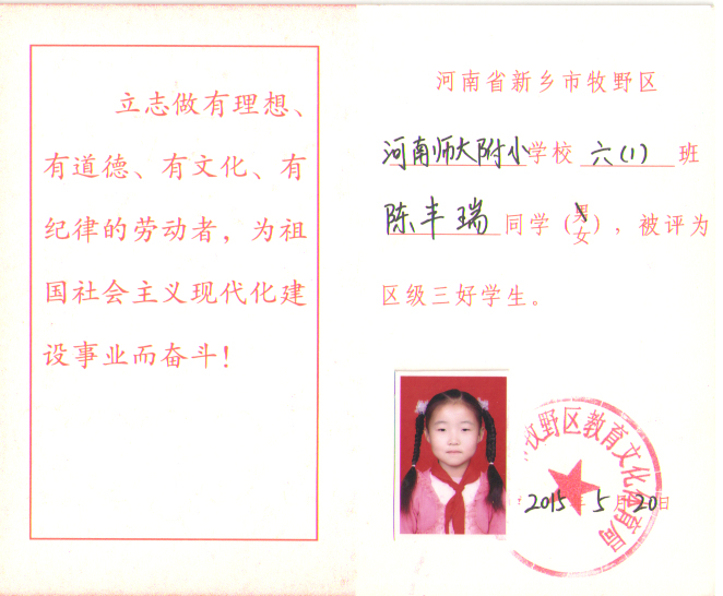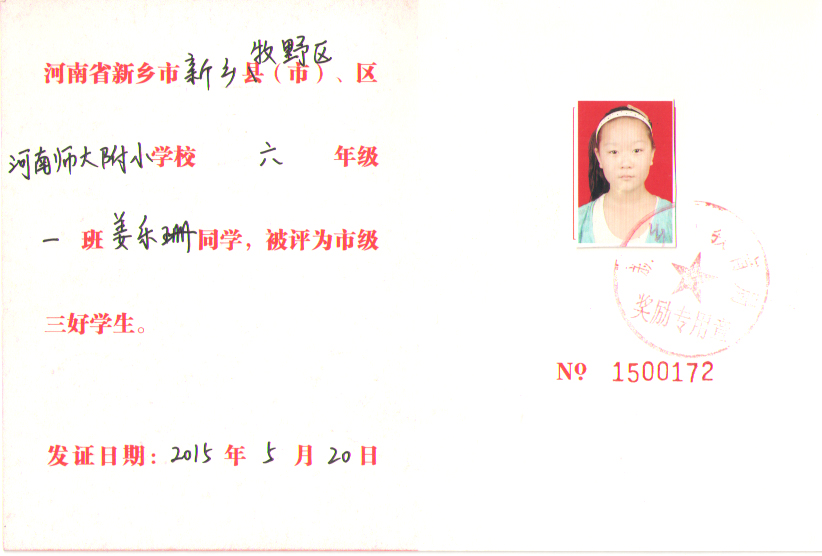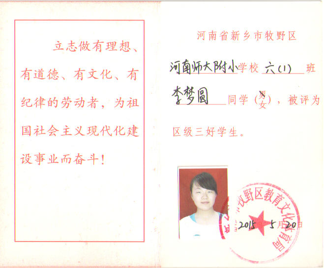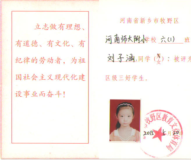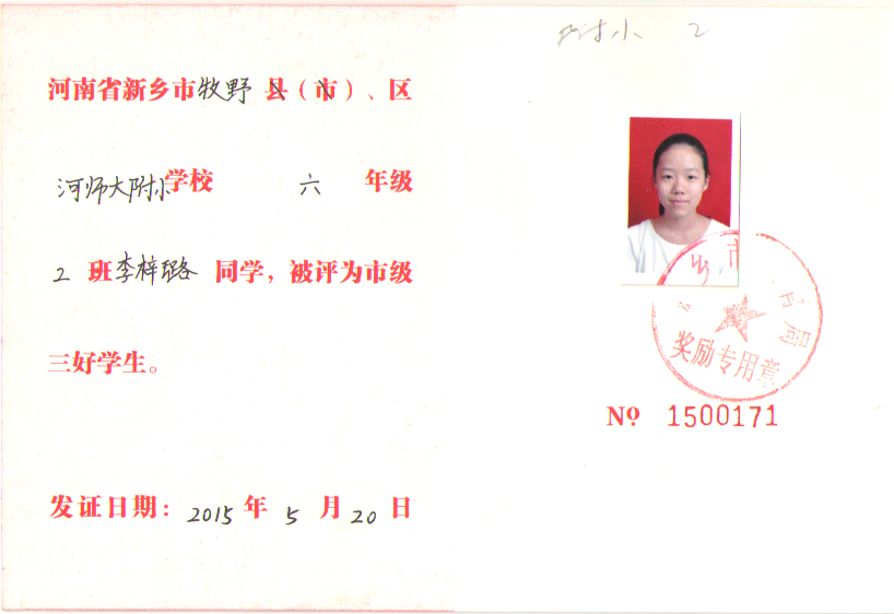 近日获悉,在新乡市、牧野区级三好学生评比活动中,李梓璐、姜乐珊等2名同学被评为新乡市三好学生;肖怡笑、张冉、常诗雨、李梦圆、孟可馨、陈丰瑞、刘子涵等7名同学被评为牧野区三好学生。
