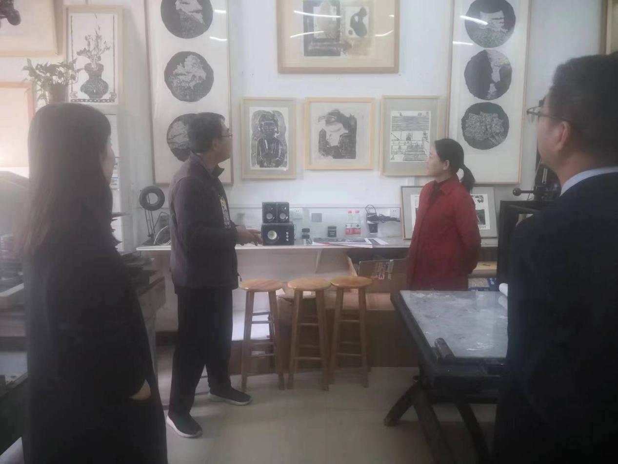 随后来到陈雷教授版画工作坊。陈教授讲解了版画的创作方法以及版画基地开展情况,饶有兴趣进行了体验活动。