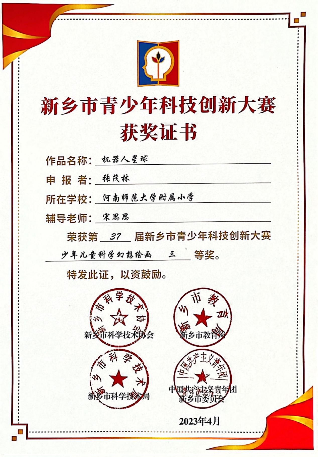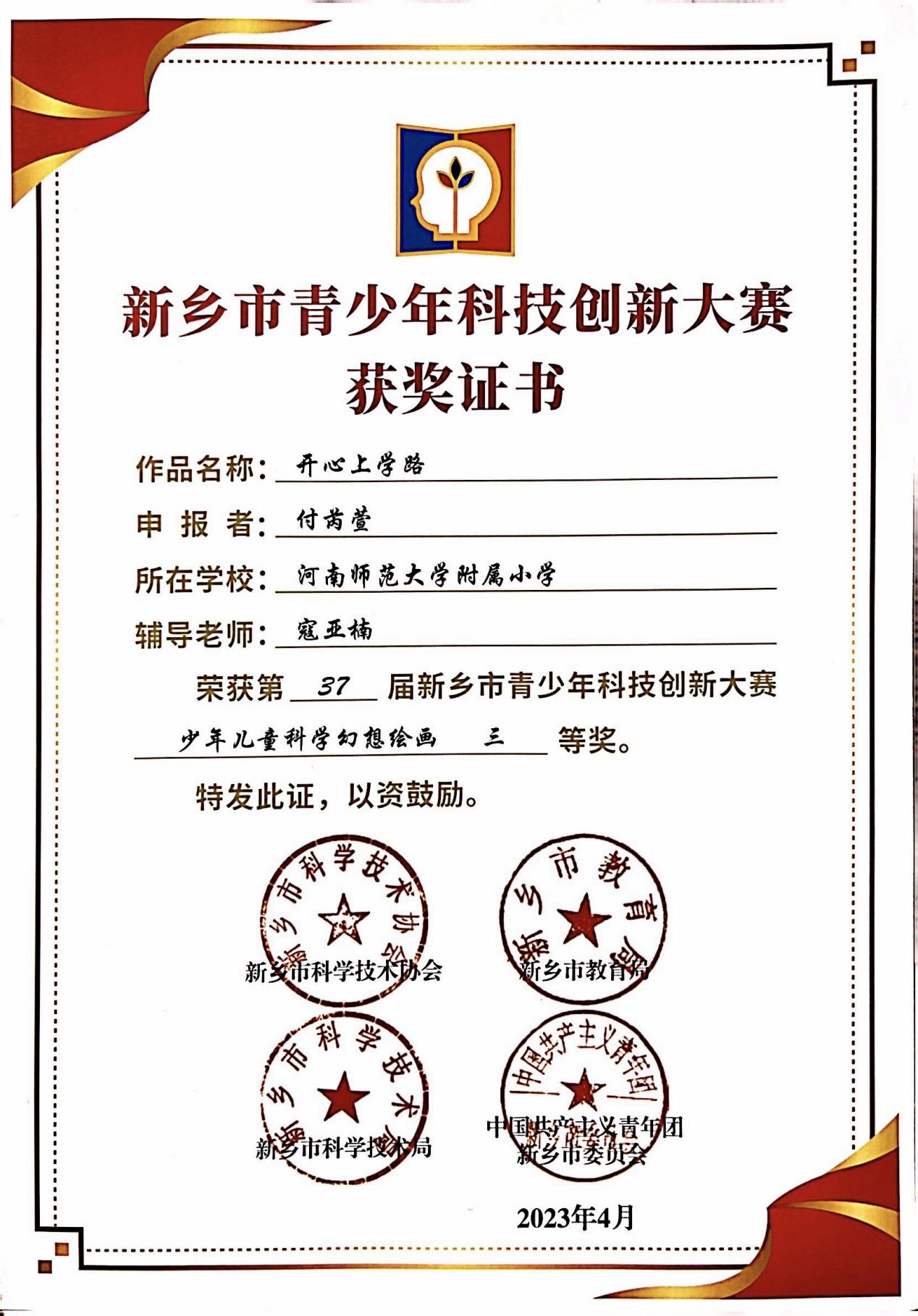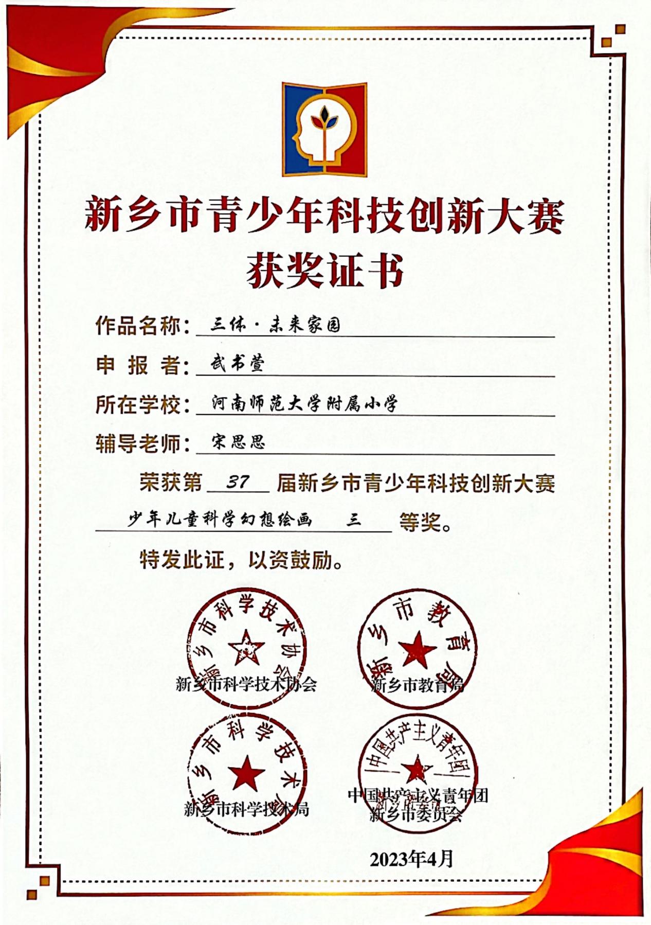 我校在第37届新乡市青少年科技创新大赛中,成绩优异。其中,寇亚楠老师荣获优秀辅导教师奖。比赛期间,在寇亚楠老师和宋思思老师的辅导下,多名学生荣获奖项。其中,曾子为、牛文木两位同学荣获一等奖;王习斌同学荣获二等奖;李欣窈、武书萱、张茂林、裴美涵、付芮萱、佘奕茗六位同学荣获三等奖。