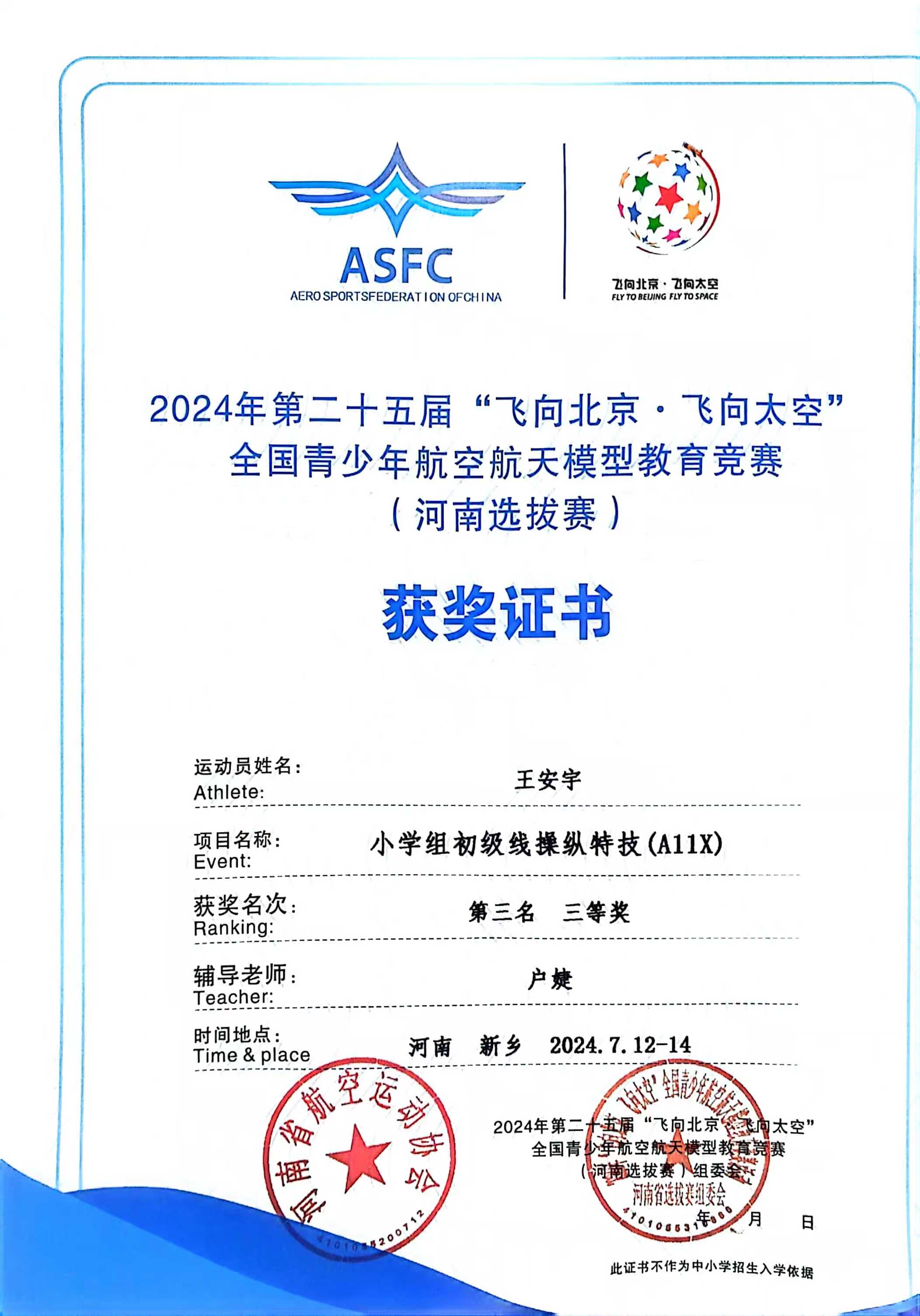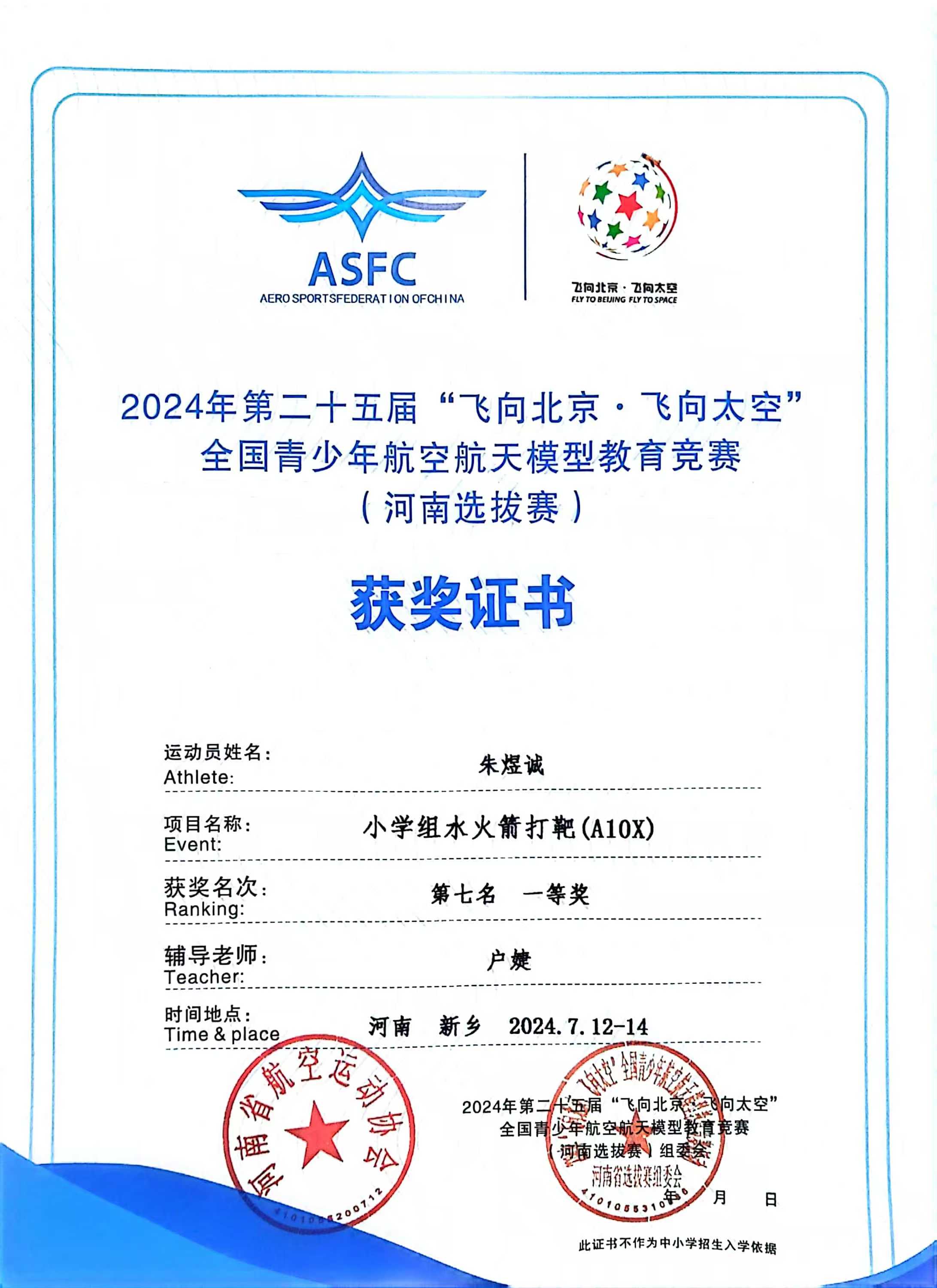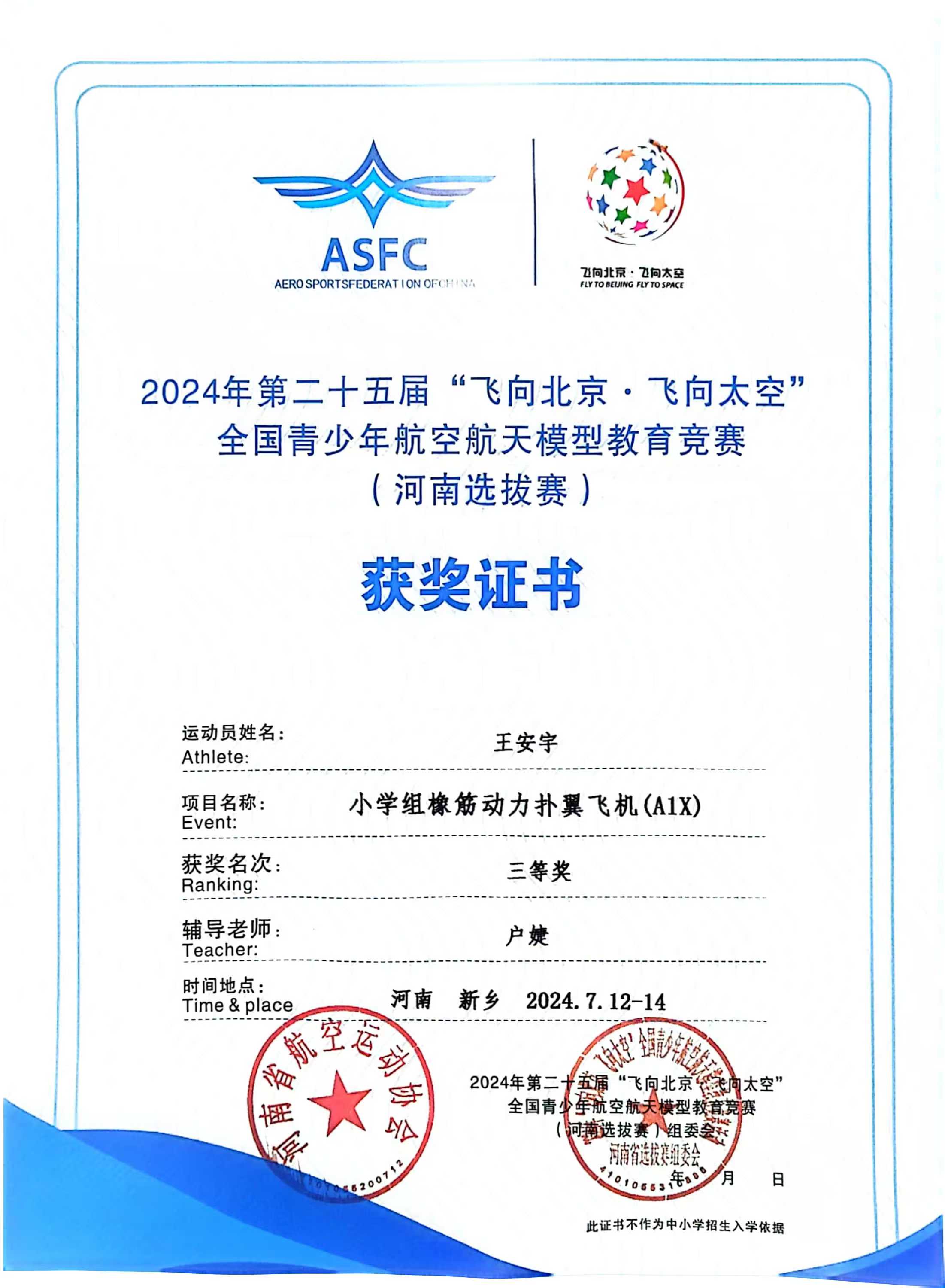 在2024年第二十五届“飞向北京·飞向太空”全国青少年航空航天模型教育竞赛(河南选拔赛)中,户婕老师指导的邱之洲、郑钤予、崔梓烁、王安宇、朱煜诚获得优异的成绩。