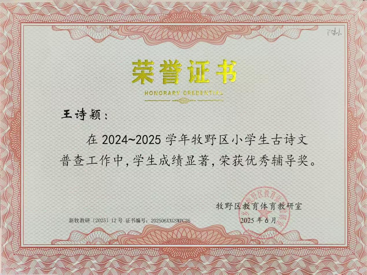 学年牧野区小学生古诗文普查工作中,我校学生表现突出,成绩显著,申茜、李新颖、王诗颖三位老师荣获优秀辅导奖。