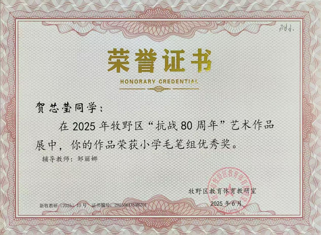 在2025年牧野区“抗战80周年”艺术作品展中,我校宋思思老师辅导的马伊可同学获小学铅笔组优秀奖,邹丽娜老师辅导的贺芯莹同学荣获小学毛笔组优秀奖。