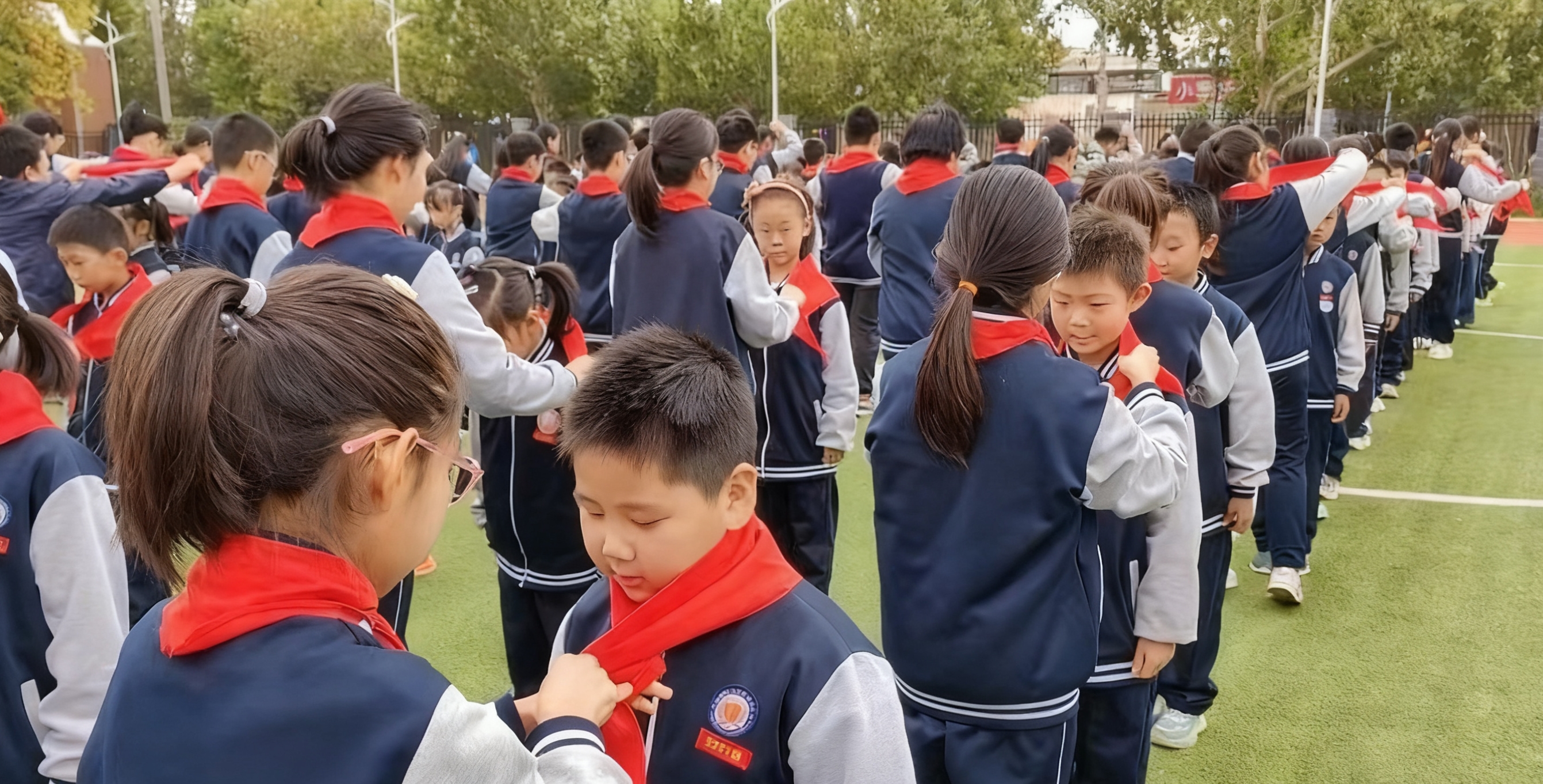 五、六年级的优秀少先队员为新队员们佩戴上了鲜艳的红领巾。当红旗的一角在胸前飘扬,新队员的脸上洋溢着激动与自豪,红色基因在这一刻完成了庄严传承。