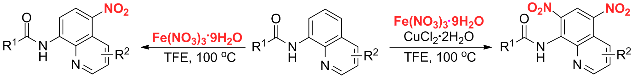 8). Yan He, Ningning Zhao, Liqi Qiu, Xinying Zhang*, and Xuesen Fan*. Regio- and Chemoselective Mono- and Bisnitration of 8-Aminoquinoline Amides with Fe(NO3)3·9H2O as Promoter and Nitro Source. Org. Lett., 2016, 18 (23), 6054–6057.