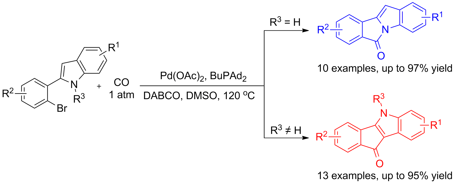 9). Shenghai Guo,* Li Tao, Fang Wang, Xuesen Fan.* Pd-Catalyzed Cyclocarbonylation of 2-(2-Bromoaryl)indoles with CO as a C1 Source: Selective Access to 6H-Isoindolo[2,1-a]indol-6-ones and Indeno[1,2-b]indol-10(5H)-ones. Chem. Asian J., 2016, 11, 3090-3096. |