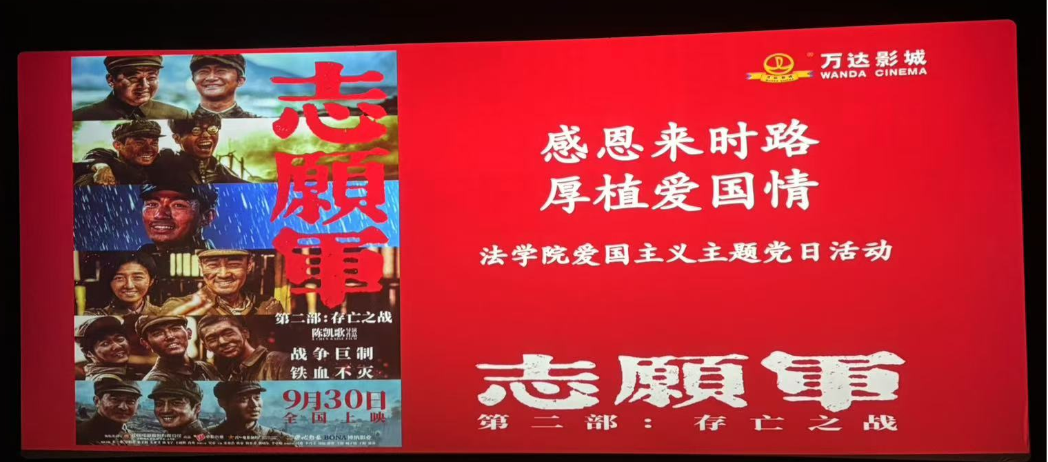 为坚定历史自信,牢记峥嵘岁月,增强法学院党员队伍凝聚力,11月14日下午,法学院组织新发展党员及教师党员开展“感恩来时路,厚植爱国情”主题党日活动,赴新乡万达影城共同观看影片《志愿军:存亡之战》,从红色精神血脉中汲取奋进力量。