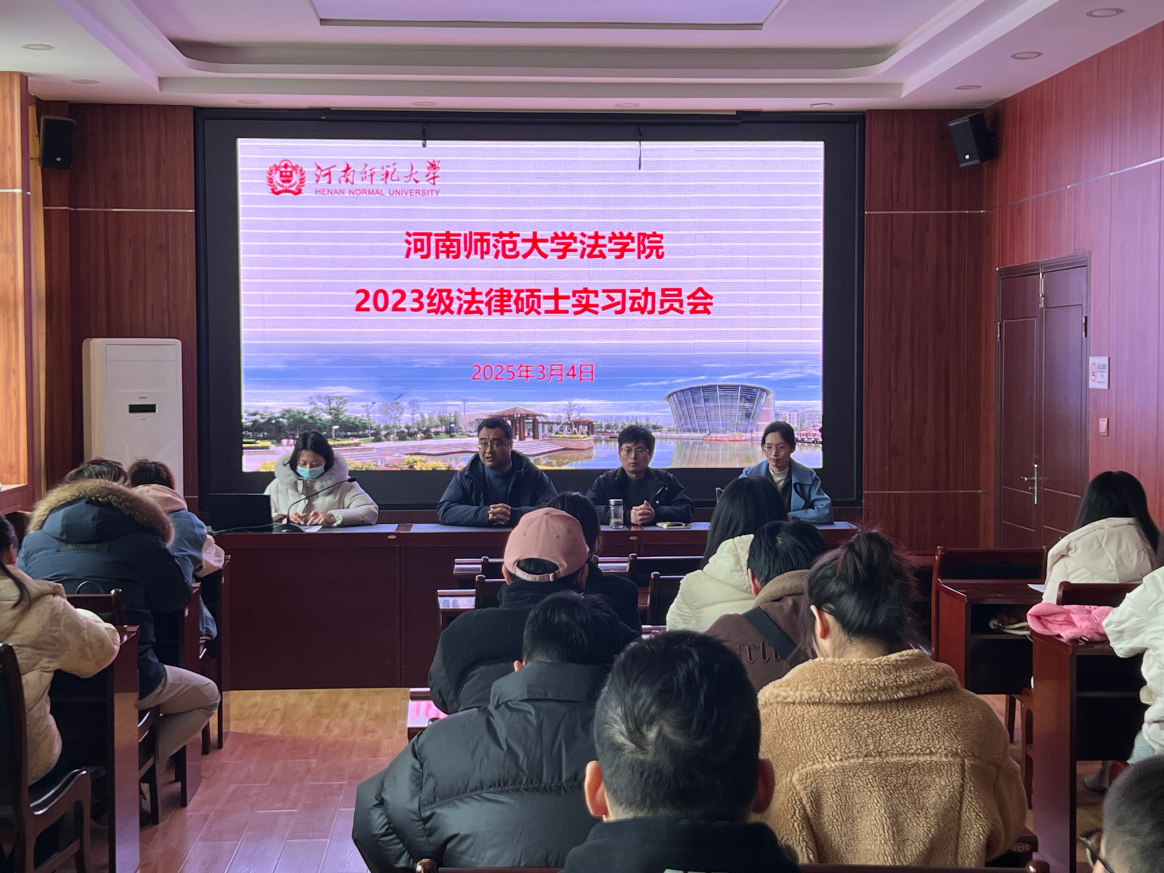 3月4日下午,法学院2023级法律硕士实习动员会在崇法楼301会议室举行。法学院副院长胡光、研究生工作秘书徐晓、研究生专业实习负责人丰瑞娜、研究生辅导员王亚楠以及2023级全体法律硕士研究生参加会议,会议由法学院副院长胡光主持。