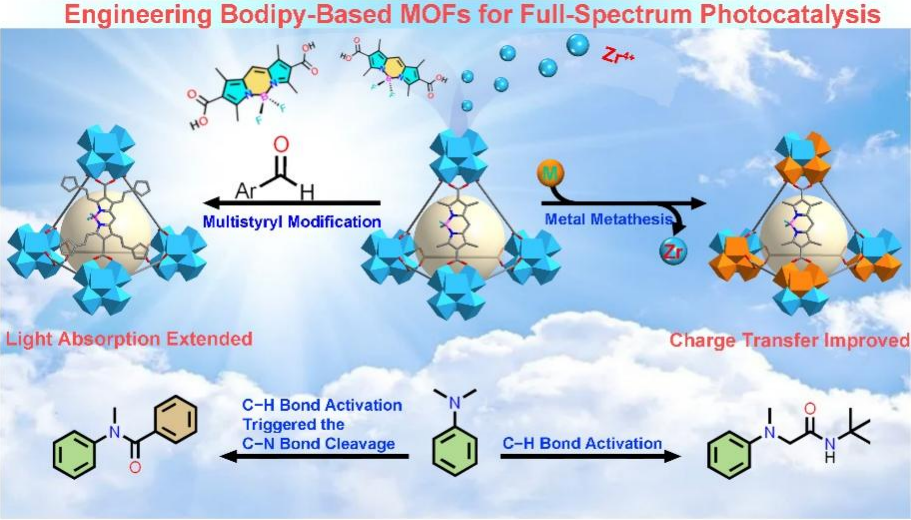 传统金属-有机框架(MOFs)作为光催化剂因其光响应范围有限,限制了其光催化能力,而开发全光谱响应的光催化剂是实现可持续能源转化的重要挑战。研究团队通过羧基功能化bodipy配体与Zr-oxo
