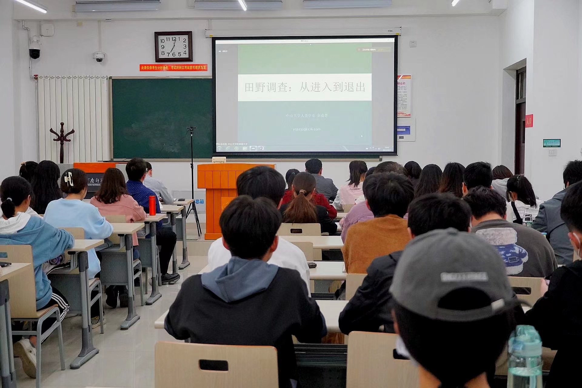 余成普从田野调查的质性研究的逻辑切入,提出田野调查何时进入、何时退出等相关问题,引发学生思考。他通过自身开展田野调查的经历,指出田野调查应当融入村民生产生活中,与村民同作息、同劳动。随后,余成普深入说明了田野调查的基本要求,针对田野调查资料收集过程中可能出现的问题,他认为应当循序渐进、不急不躁,建议学生“走出去、学会听、多交谈、细观察、多记录”。最后,余成普强调田野调查中最为重要的是参与,田野的进入需要提前,退出需要延后。