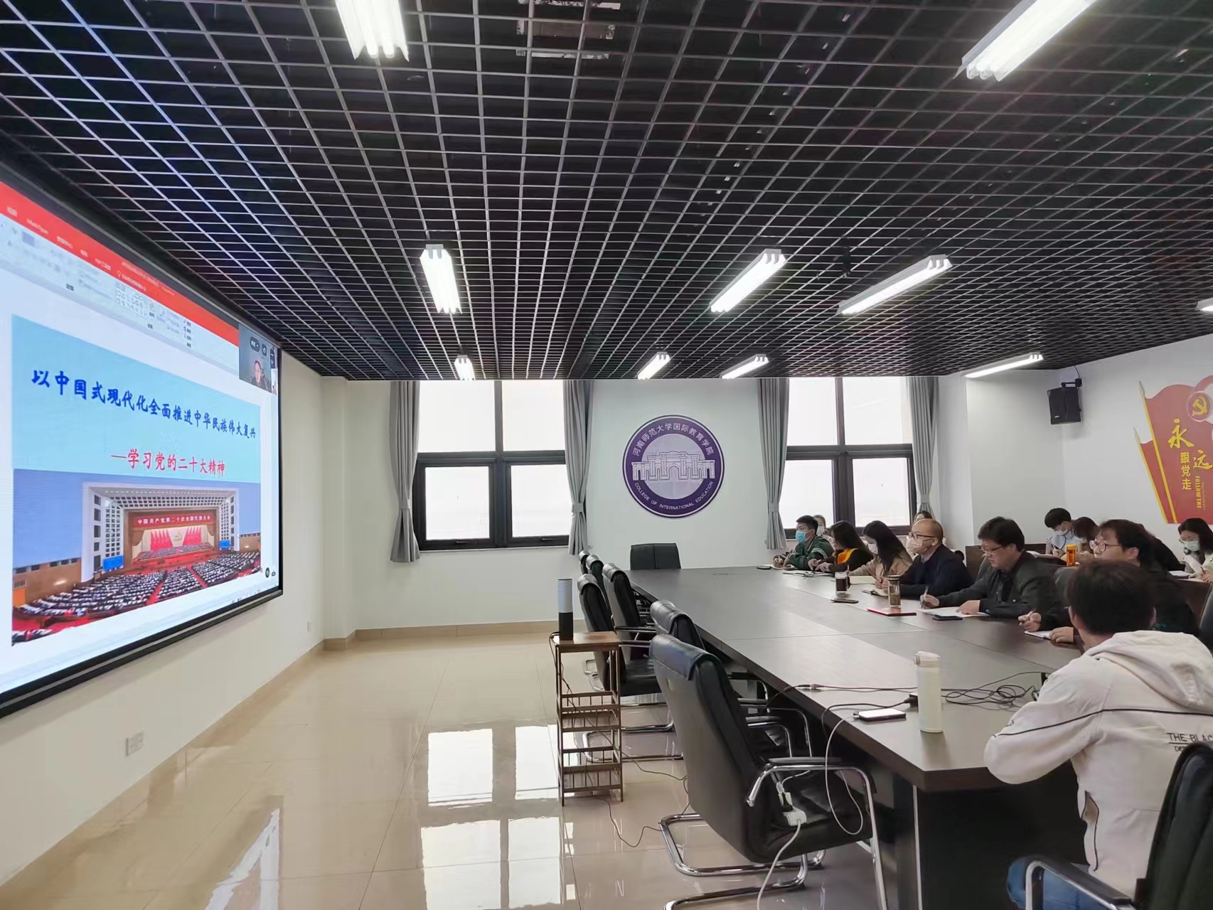 为深入扎实学习宣传贯彻党的二十大精神,落实落细立德树人根本任务,引领学院师生永听党话、紧跟党走,10月30日下午,国际教育学院在学院会议室举行党的二十大精神学习辅导,特邀全国模范教师、我校社会事业学院原院长罗建平教授主讲。学院全体教师、学生党员、入党积极分子等近500人线上线下同时聆听。学习辅导由院党委书记田小勇主持。