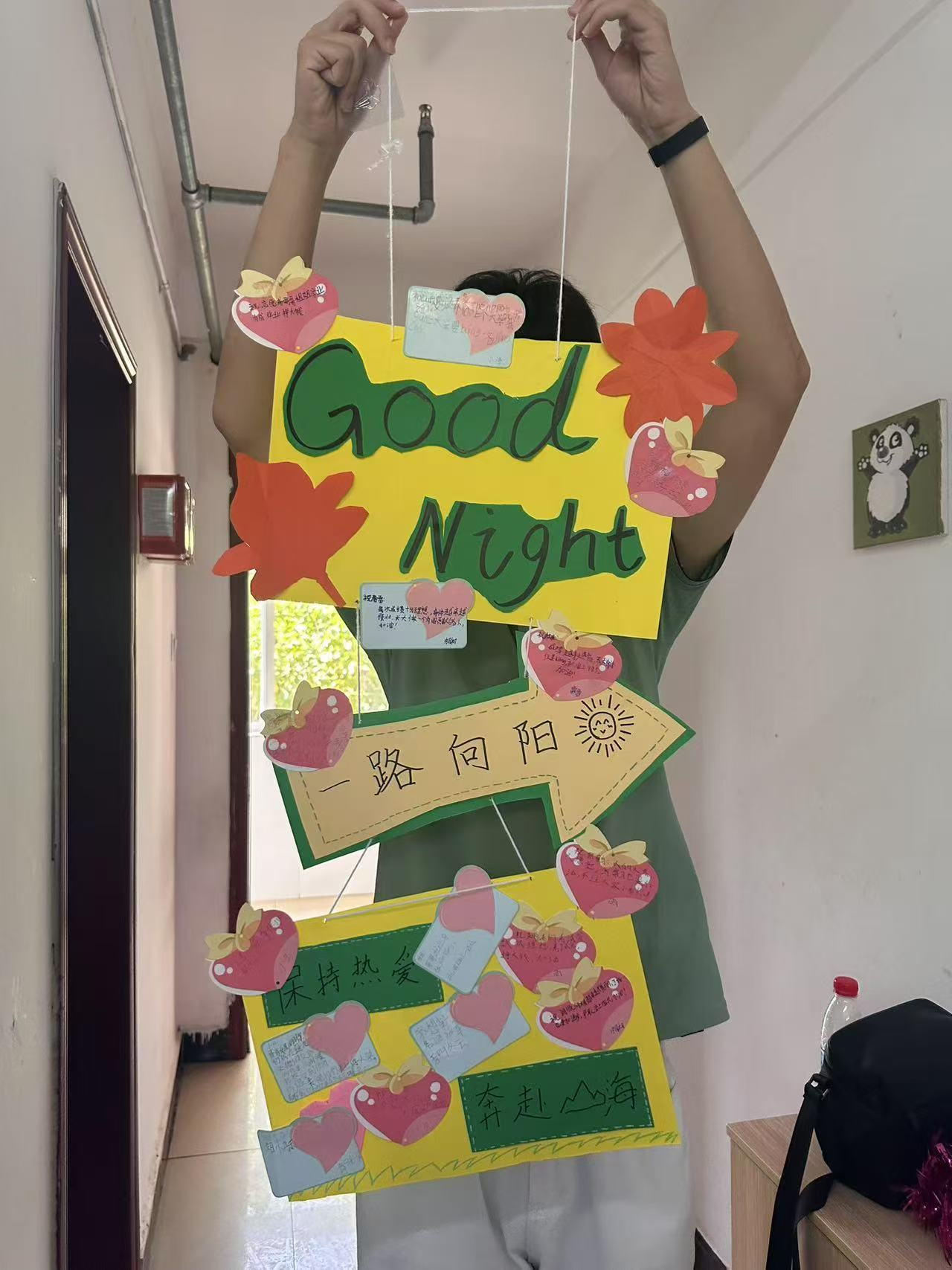 活动现场,追光青年团队将精心制作的手工艺品布置在儿童宿舍。色彩斑斓的剪纸、憨态可掬的黏土装饰,错落装点在白色的墙壁上,原本朴素的空间瞬间充满了童趣与温馨。“手掌画”互动环节,团队成员引导孩子们拓印手掌轮廓,在画作上写下“愿你永远向阳生长”“勇敢追逐梦想”等暖心寄语。孩子们用稚嫩的声音,羞涩的说出“谢谢哥哥、姐姐”。
