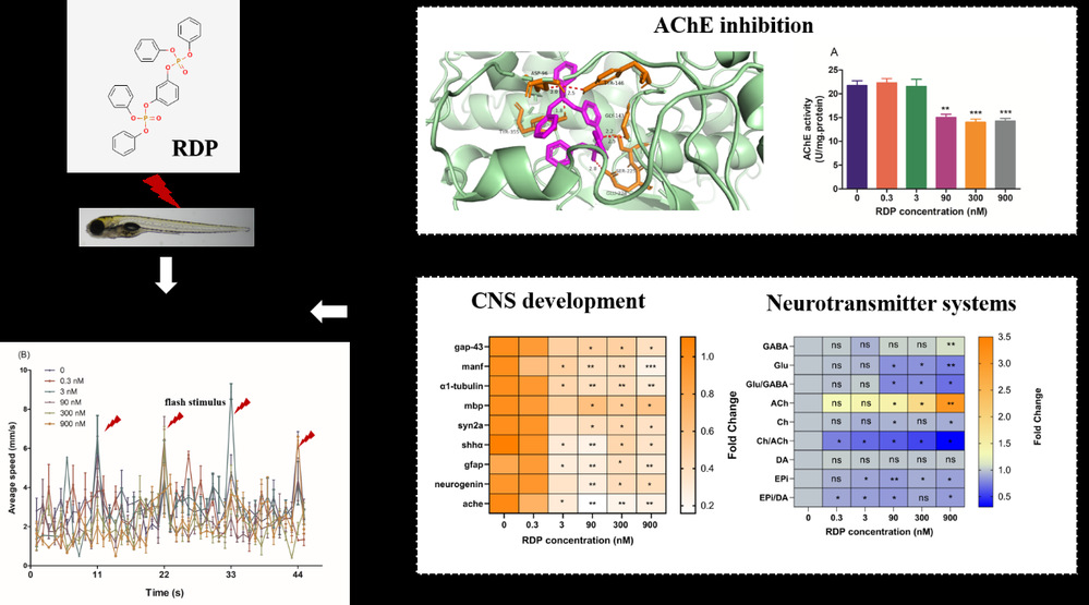 在该项研究中,作者研究了新型有机磷阻燃剂RDP对斑马鱼仔鱼的神经发育毒性。研究发现,RDP的急性暴露能够显著抑制斑马鱼仔鱼的乙酰胆碱酯酶活性,改变乙酰胆碱、胆碱、γ-氨基丁酸、谷氨酸等多种神经递质的含量,并显著影响中枢神经系统的发育,降低仔鱼的运动行为,从而引起仔鱼的神经毒性效应。该研究表明新兴有机磷阻燃剂的毒性和生态风险不容忽视。
