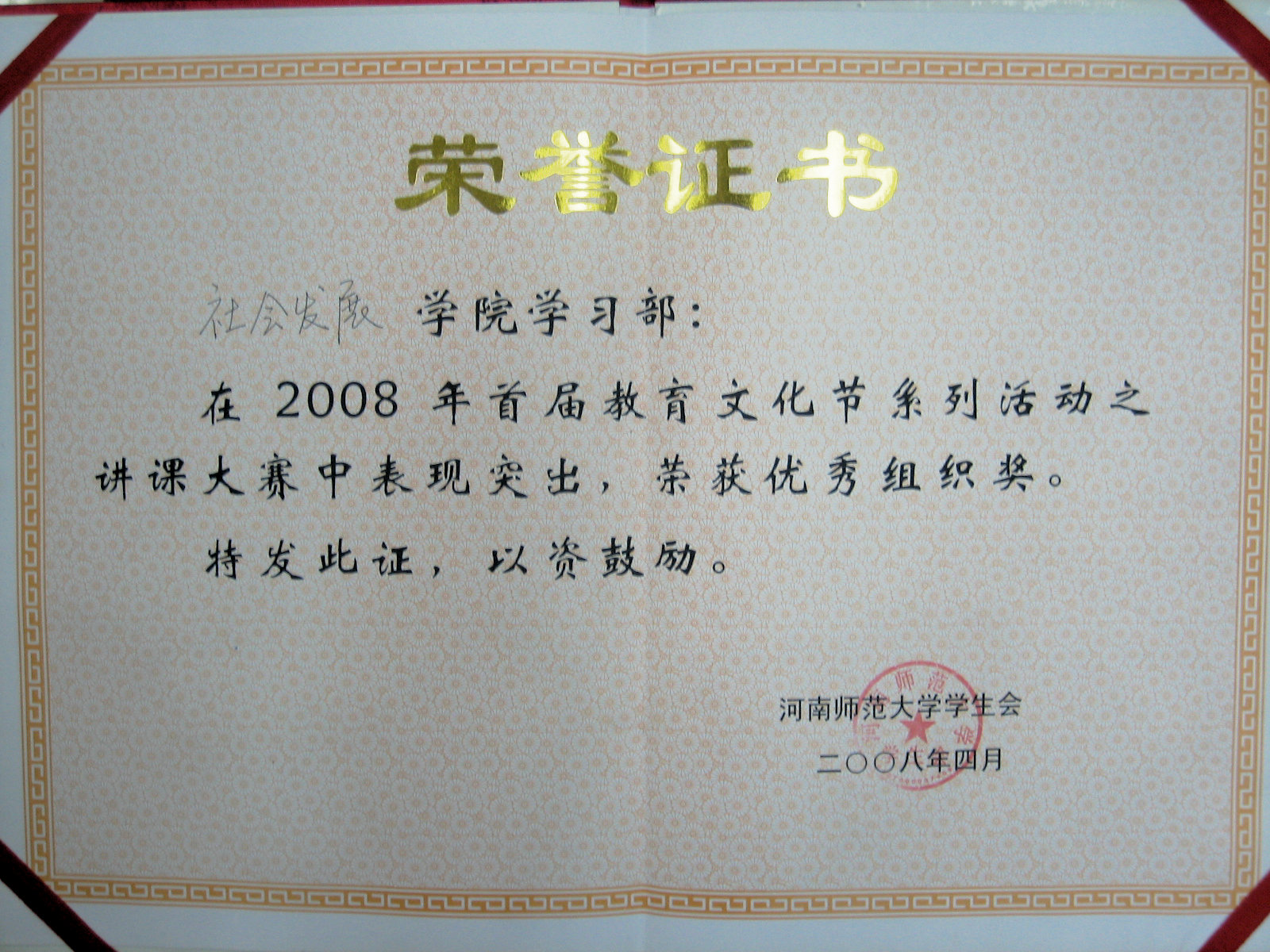 社会发展学院在2008年首届教育文化节系列活动之讲课大赛中荣获优秀组织奖