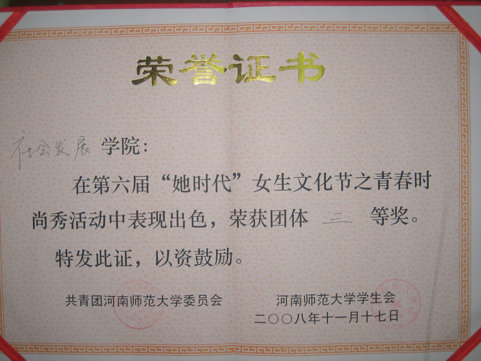 “她时代”女生文化节之青春时尚秀活动中荣获团体三等奖