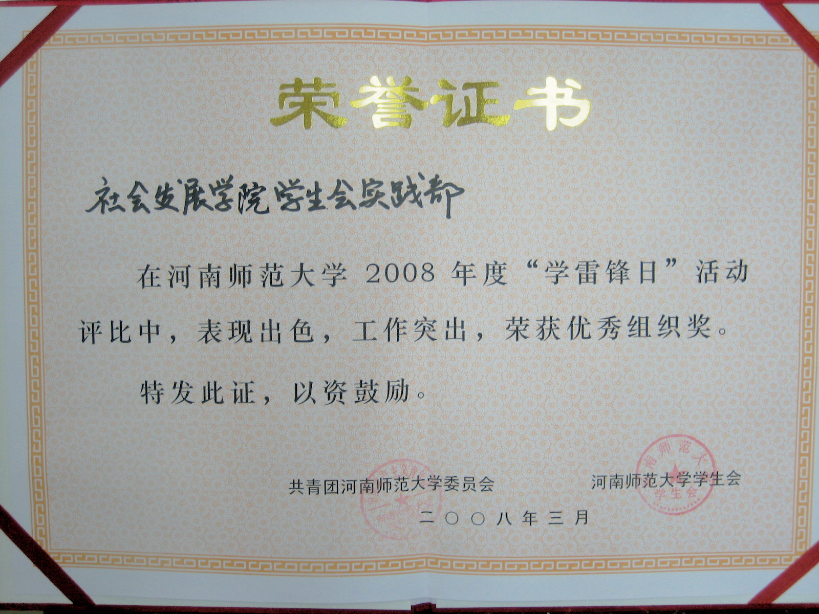 社会发展学院在河南师范大学2008年度“学雷锋日”活动中荣获优秀组织奖