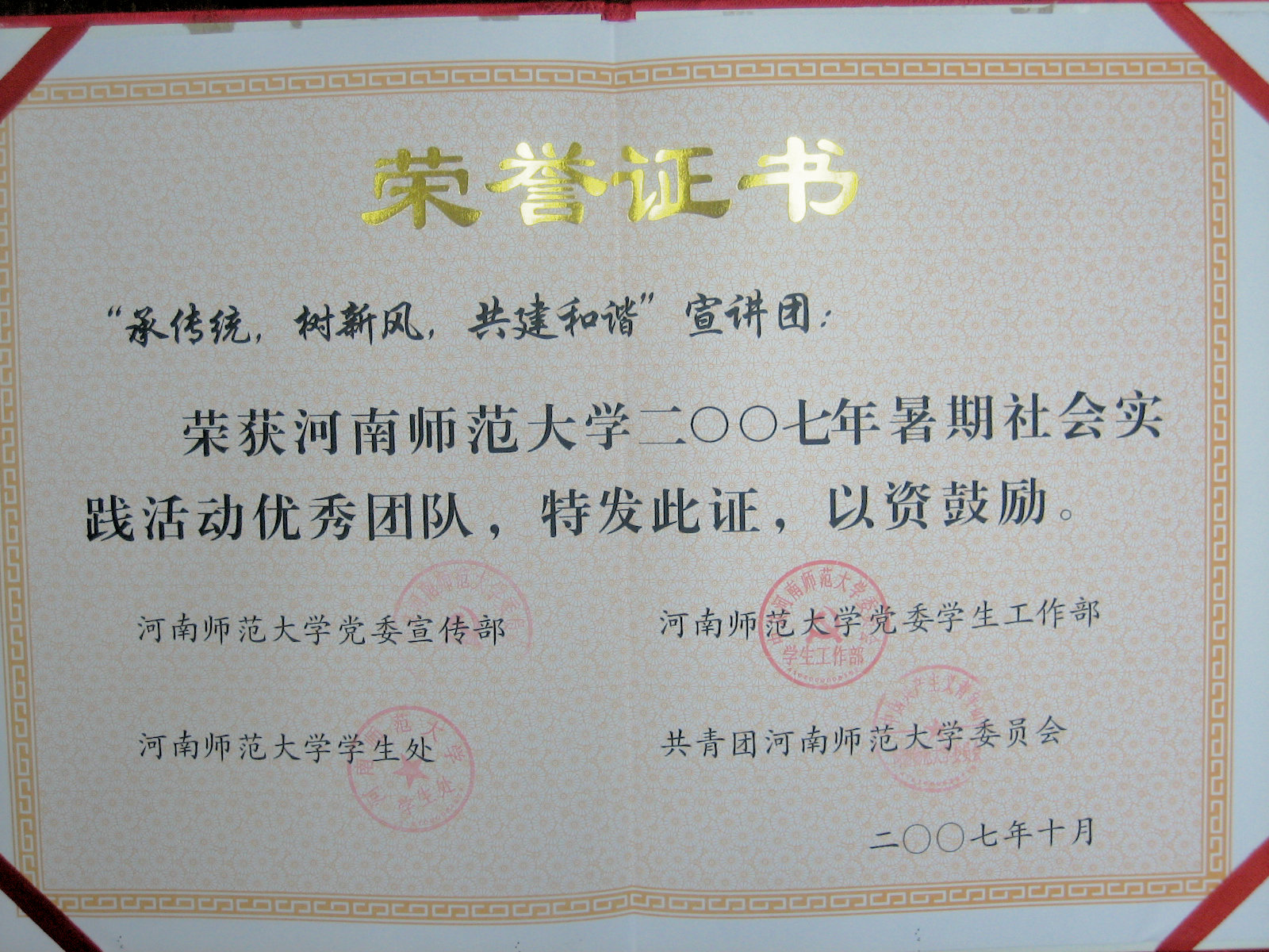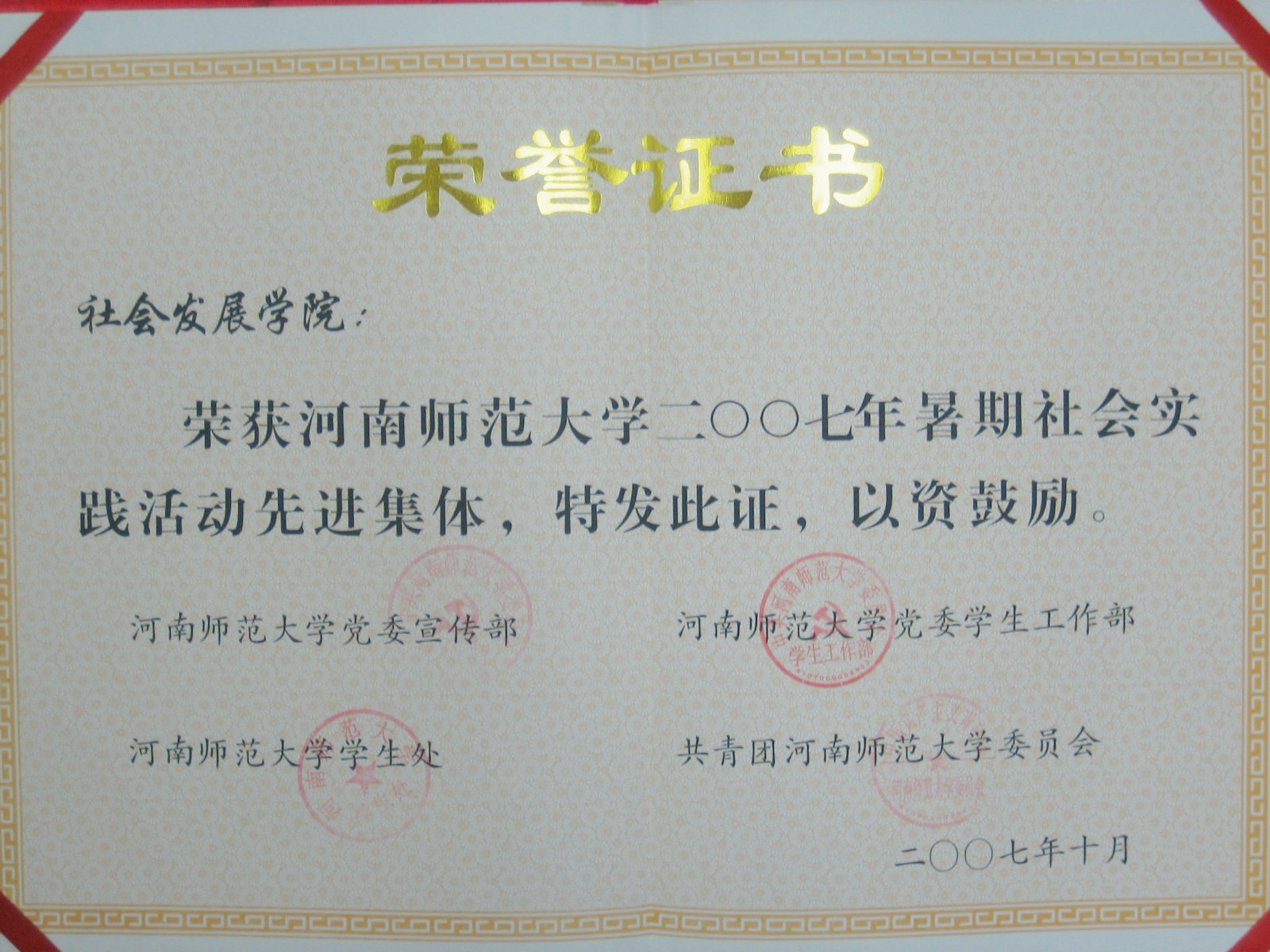 河南师范大学二零零七年暑期社会实践活动优秀团队