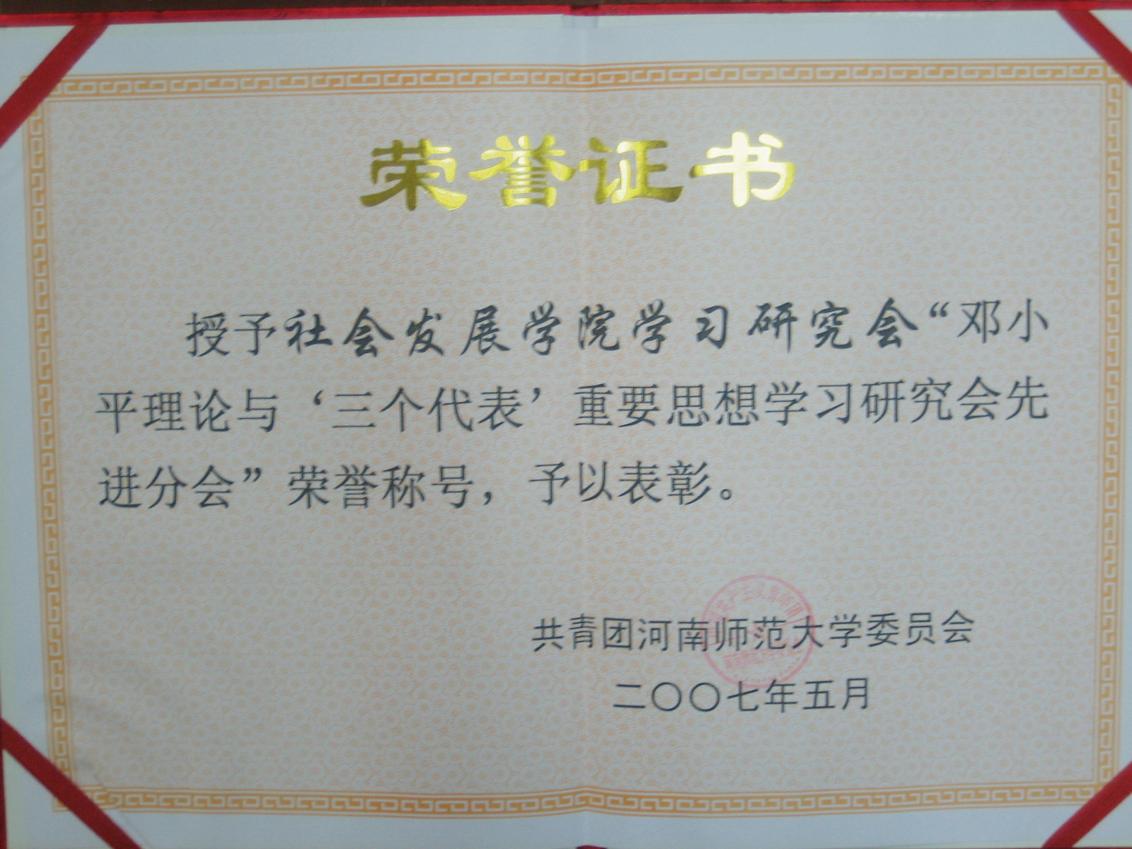 授予社会发展学院“邓小平理论与‘三个代表’重要思想学习研究会先进分会”荣誉称号
