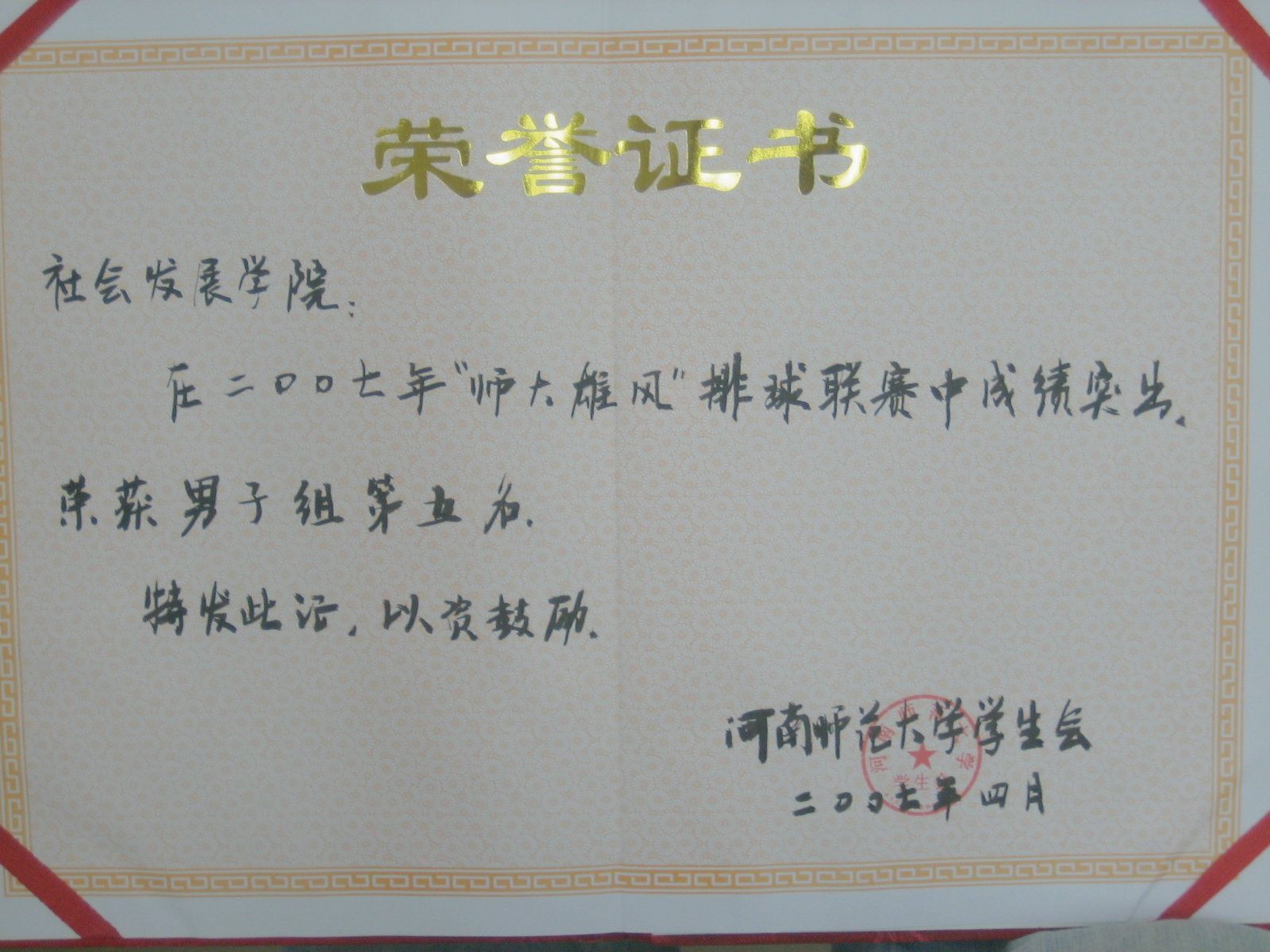 二零零七年“师大雄风”排球联赛中荣获男子组第五名