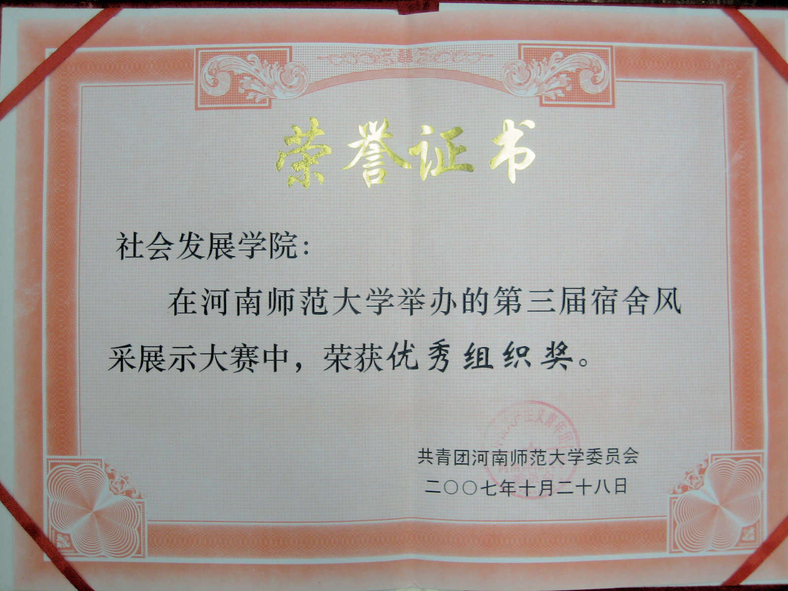 第三届宿舍风采展示大赛中荣获优秀组织奖