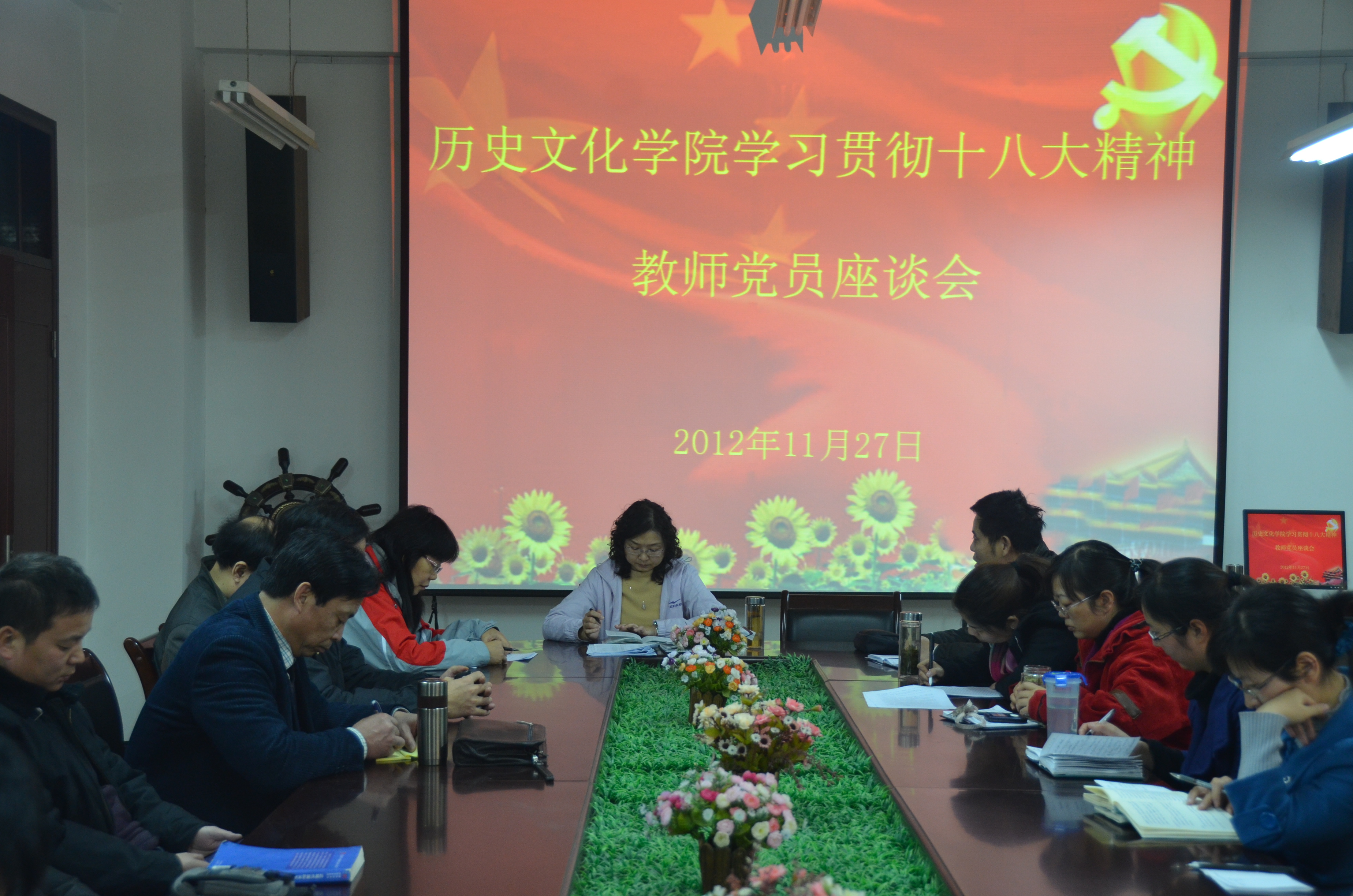 11月27日下午,历史文化学院在会议室举办学习贯彻十八大精神教师党员座谈会。学院领导班子、全体教师党员参加了本次座谈会,会议由院党总支书记王霞主持。