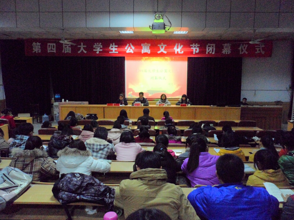 筑梦我的家,欢乐你我他。11月30日19:00,第四届大学生公寓文化节闭幕仪式在党课教室隆重召开。出席闭幕式的有历史文化学院党总支书记王霞、党总支副书记郑学山、2012级辅导员李新艳。仪式由院团委书记张利兵主持,学院各年级学生代表三百余人参加了闭幕式。
