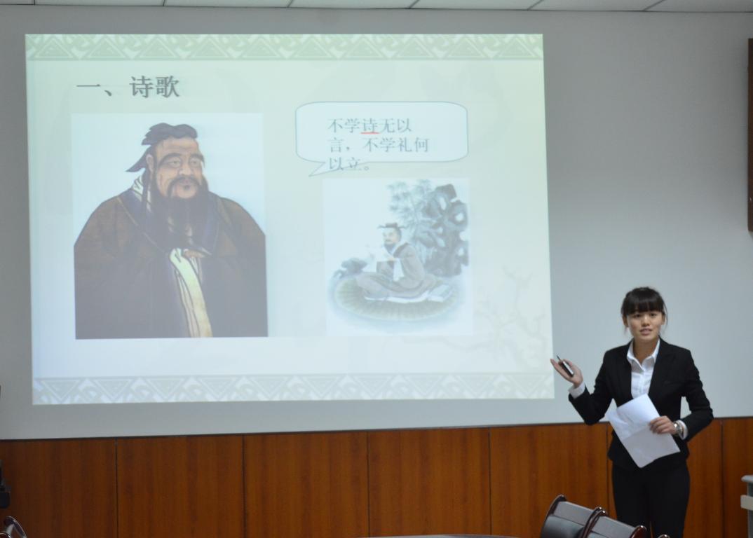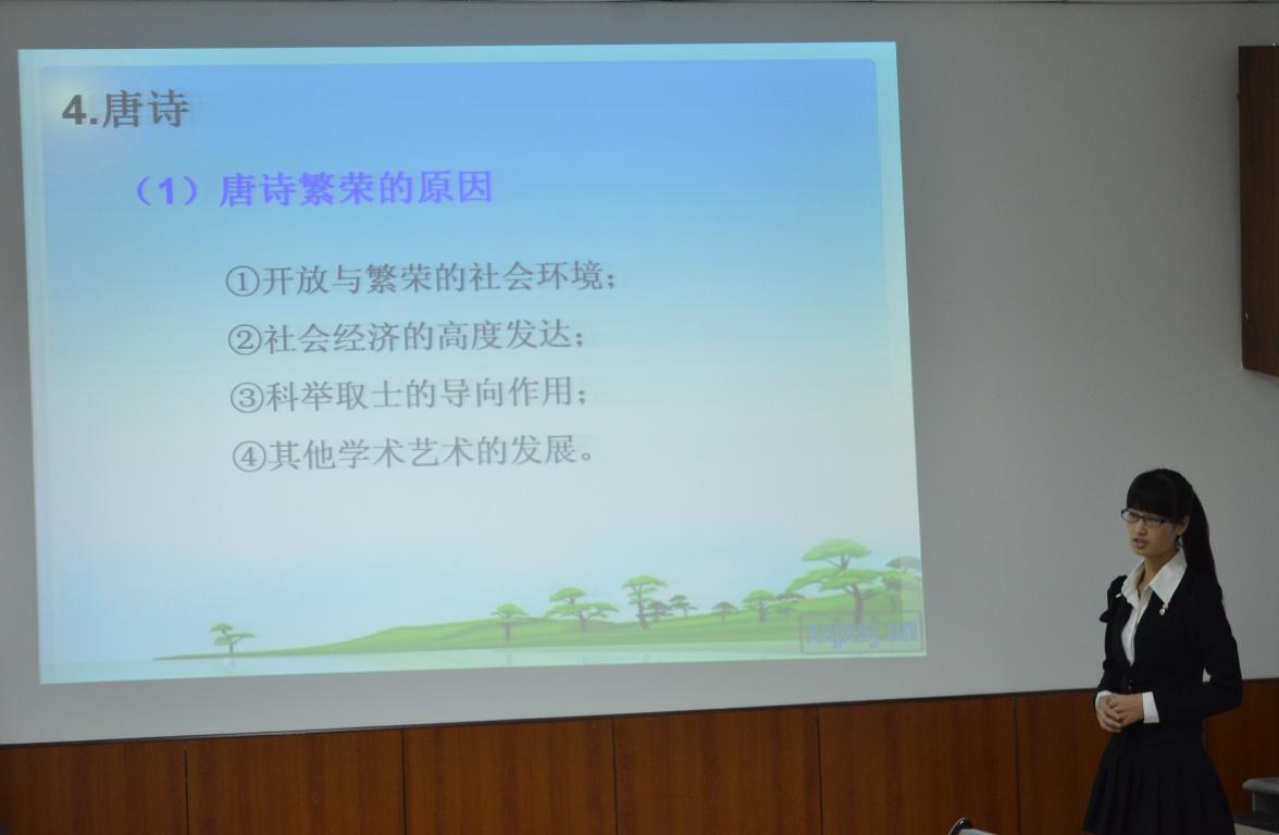此次比赛共有13名同学参赛,他们是班级中教学技能方面的佼佼者。正式比赛开始后,同学们或以温习旧课导入新课,或以古典诗词步入正题。在讲授过程中,同学们或慷慨激昂地朗诵《大江东去》,或婉约深情地浅唱《明月几时有》,配以精美图片,引人入胜。在小结环节,或以布置作业,或以提出问题等完美收宫。