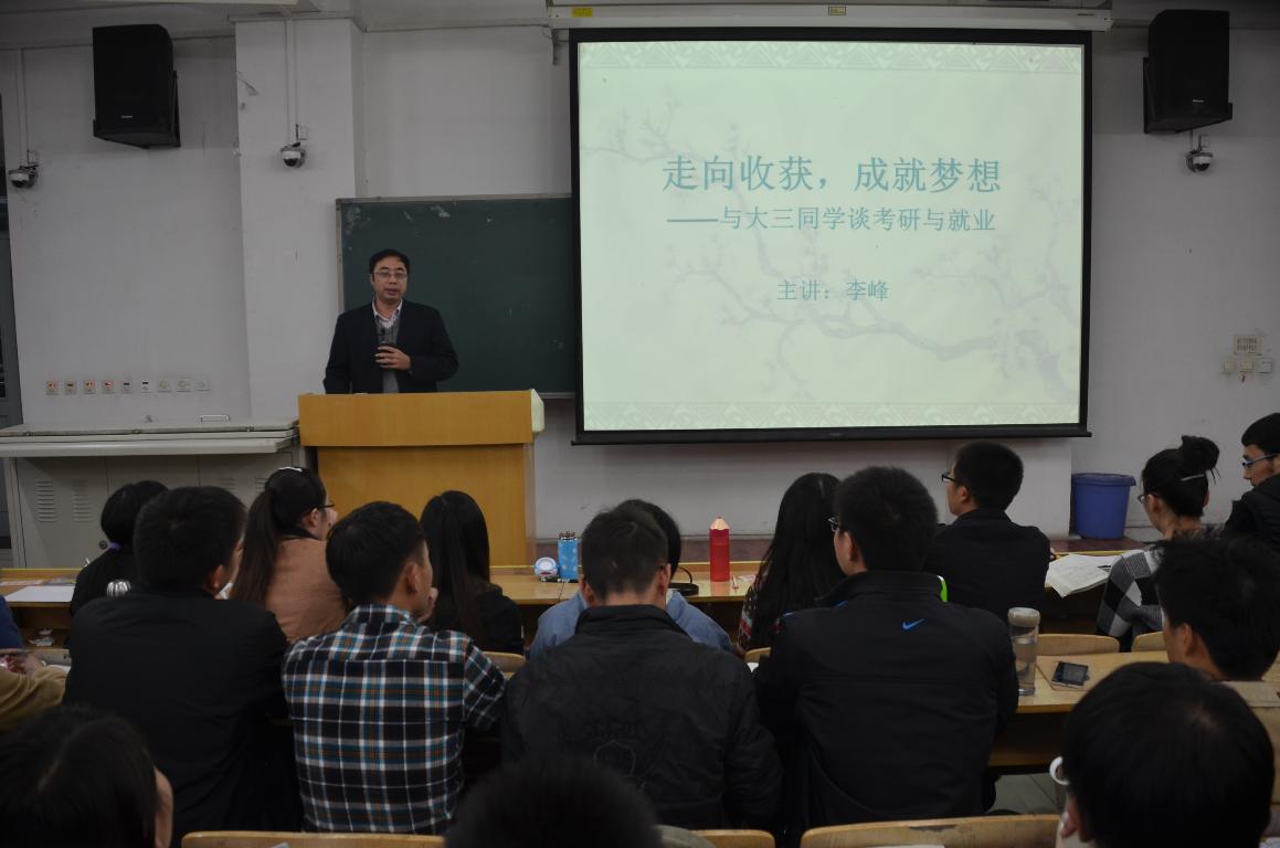 副院长李峰老师做了“走向收获,成就梦想”的专题讲座。他着重向同学们讲解了大学生应如何把握四年的大学生活,提出了合理分配时间,提高自身综合素质的建议。针对同学们关心的就业问题,他做出了详细的分析,给予同学们合理化的建议与指导。
