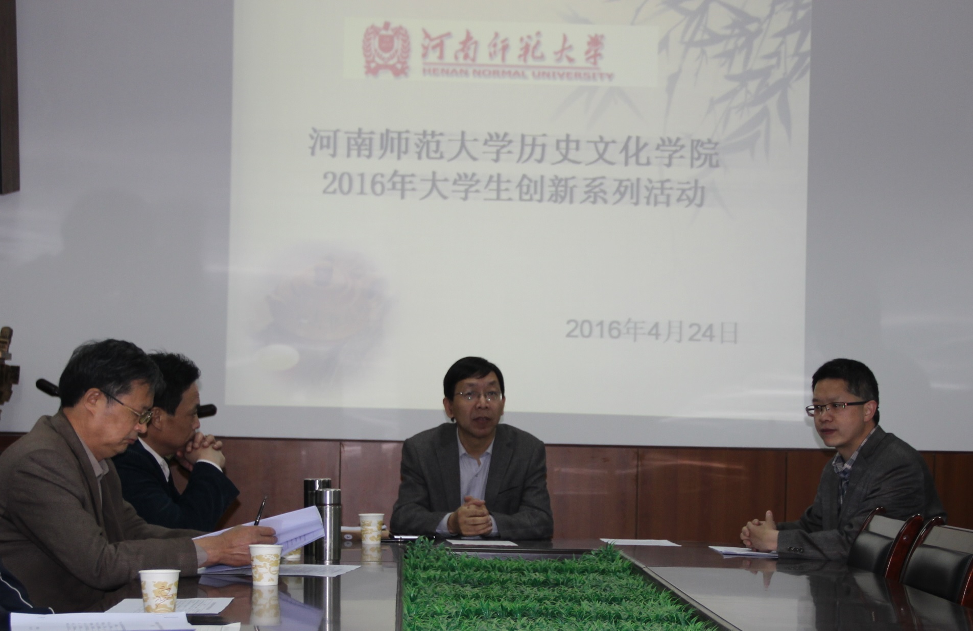2016年4月24日,历史文化学院在学院二楼小会议室举行2016年“大学生创新创业训练计划”相关活动。活动由张建辉老师主持,活动之初,历史文化学院院长巨永明教授发表重要讲话,他指出创新是一个民族的灵魂,大学生应重视创新能力的培养,“大学生创新创业训练计划”为大学生提供了良好的发展、锻炼平台,因此同学们要珍惜这份大学生才拥有的宝贵机会,积极申报,申报成功之后,排除各种困难,认真完成项目,历史文化学院将一如既往地大力支持“大学生创新创业训练计划”,将此项活动发展成为本院的科研特色品牌活动。此外,张建辉老师对我院近三年的大学生创新成果进行了汇报,指出我院在往年优异成绩的基础上,积极组织广大同学申报,又取得国家级项目多项,校级项目若干的好成绩。我院将会再接再厉,创造更大的辉煌。