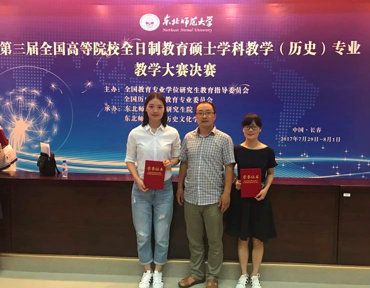 近日,2017年第三届全国高校全日制教育硕士学科教学(历史)专业教学大赛决赛在东北师范大学落下帷幕。我院由赵雅旭、王慧两位同学组成的参赛队在大赛中荣获二等奖1项、优秀教学设计奖2项,牛琳老师荣获优秀指导教师奖。在参赛过程中,我院教育硕士的教学水平和培养质量受到与会专家评委的好评。