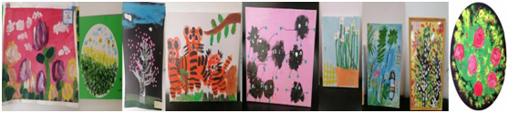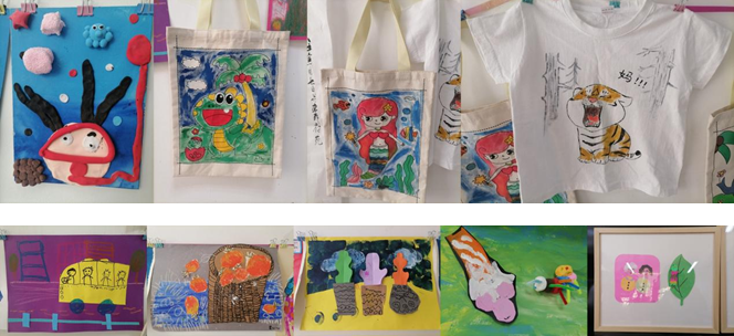 除了用纸和笔来挥洒赤橙黄绿青蓝紫,我们还进一步开动脑筋,以其他材料为载体,在书画展中斗色争妍。马小能老师、高美苏老师等所展示的彩泥作品、手绘包包、手绘T恤、剪纸作品、扭扭棒作品,让我们看到了万物都在智慧化的今天,我们也在用色彩来表达智慧!