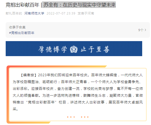 为迎接百年校庆,展现师大学人卓越风采,校党委宣传部在河南师范大学校园网特设“竞相出彩献百年”专栏,宣传学校各个领域的先进榜样,讲述师大学人的出彩故事,展现师大百年深厚底蕴,为师大发展增光添彩。近日该专栏工作人员对我院苏全有教授进行访谈,并于7月6日在校园网主页“竞相出彩献百年”专栏推出题为“苏全有:在历史与现实中守望未来”的长篇报道,该报道发表后,在广大师生中引起了强烈反响。