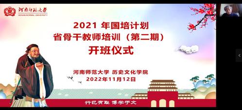 1112日上午,由我院承办的2021年国培计划省骨干教师培训(第二期)举行线上开班仪式。河南师范大学历史文化学院院党委书记李峰、院长苏全有、副院长刘葳葳,以及50名学员老师参加会议。乔传宁老师主持开班典礼。