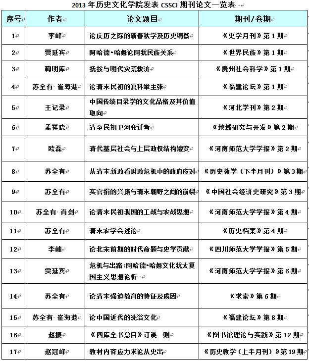 2013年历史文化学院发表CSSCI期刊论文一览表