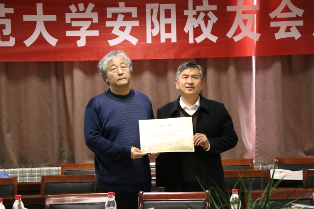 苏全有教授为安阳阳校友会历史分会授旗,并依次为新当选的分会名誉会长、会长、副会长、秘书长颁发聘任证书。
