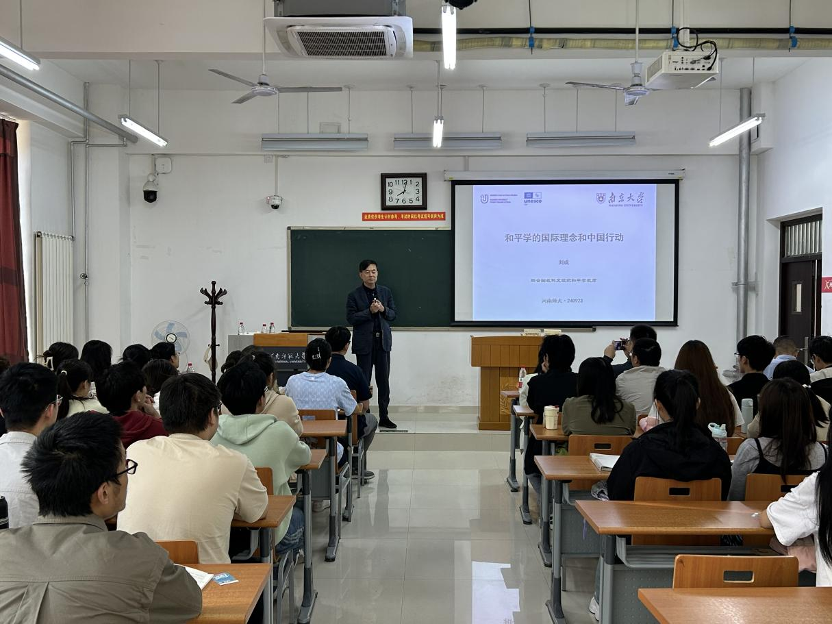 2024年9月23日,历史文化学院邀请历史学博士,南京大学历史学院教授、博士生导师,联合国教科文组织和平学教席主持人(Holder of UNESCO Chair on Peace Studies),英国与英联邦国家研究所所长,和平学研究所所长,国家社科基金重大项目首席专家刘成教授莅临我校,在文昌楼105教室为师生们带来了以“和平学的国际理念和中国行动”为主题的精彩讲座。讲座现场座无虚席,历史文化学院师生们齐聚一堂,共同聆听刘成教授的深刻见解。