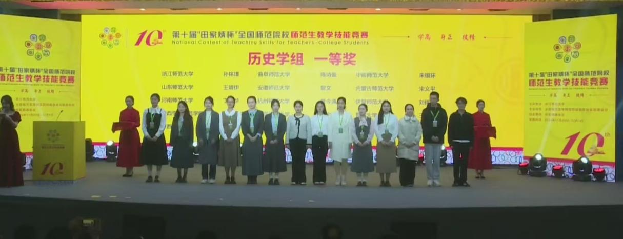 2024年11月29日至12月1日,第十届“田家炳杯”全国师范院校师范生教学技能竞赛决赛在浙江师范大学举行。我院参赛选手2022级历史学本科生丁红烨获得历史组一等奖,指导教师高美苏获得优秀指导教师奖。