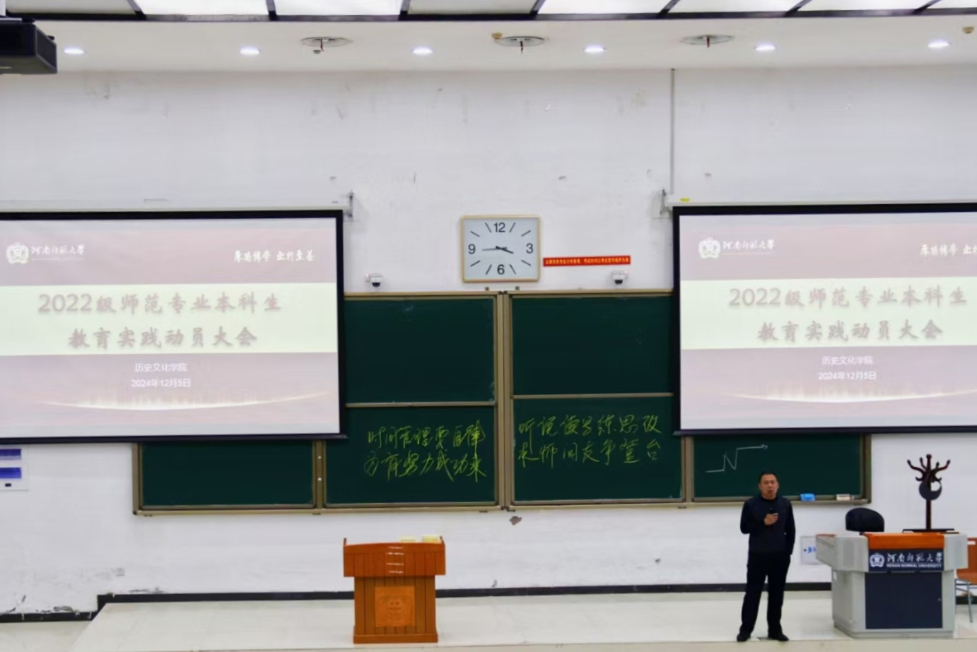 为进一步提高师范生教育实践质量,明确教育实践的目标与要求,12月5日中午,历史文化学院于文昌楼127召开了2022级师范专业本科生教育实践动员大会。历史文化学院副院长王守谦、中国史系主任葛风涛、教学秘书李伊波、实习指导教师代表、2022级专兼职辅导员及2022级全体师范生参加本次会议,会议由2024级辅导员张文华主持。