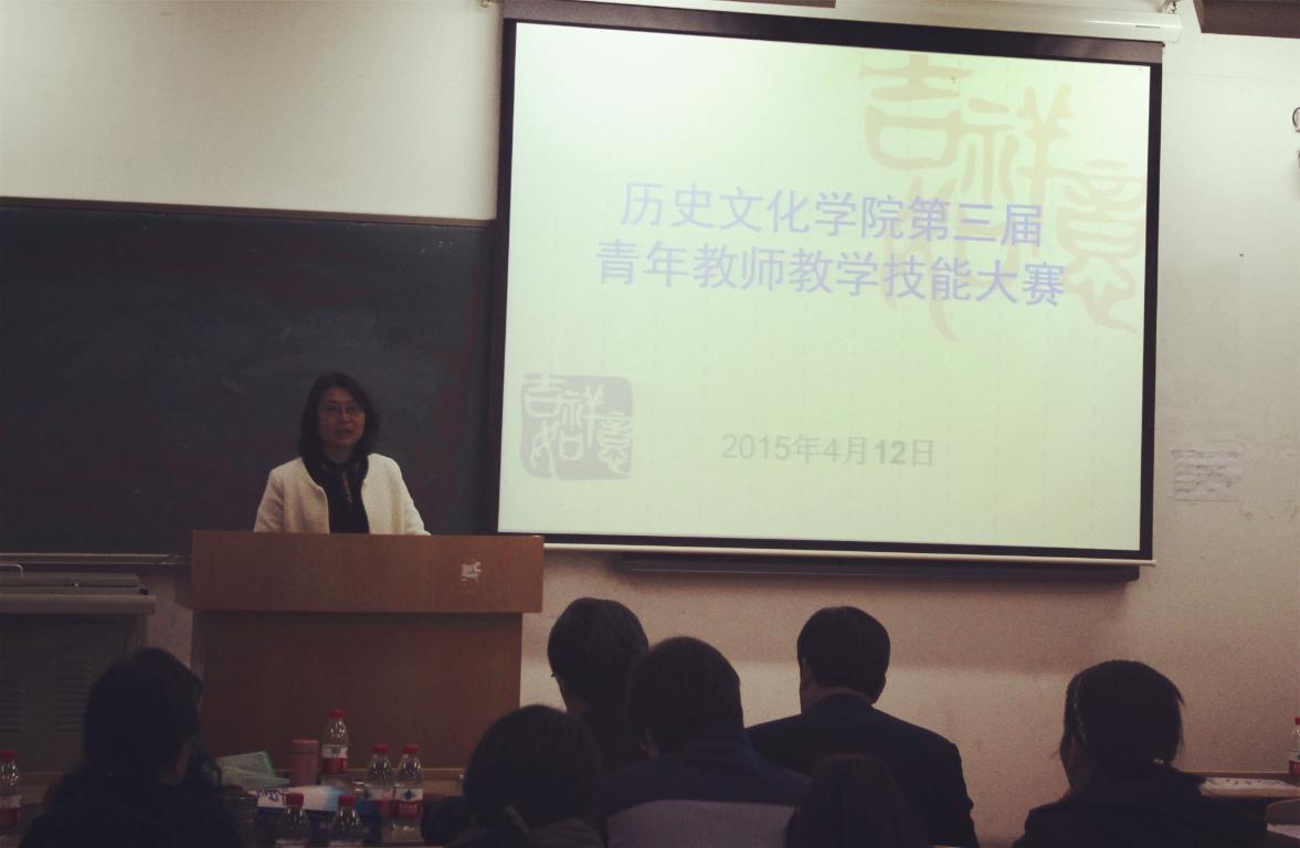 4月12日,为提升青年教师的教学技能,并推荐参加校级比赛的人选,历史文化学院在东区教学B楼及A楼的101教室,举行了学院第三届青年教师教学技能比赛。学院党委书记王霞教授莅临指导,14名青年教师、8名评委及学院2014级各专业的60多名同学参加了比赛。