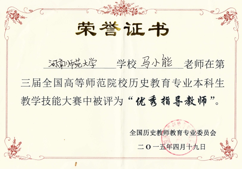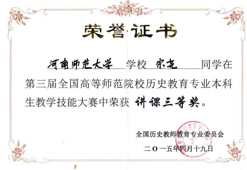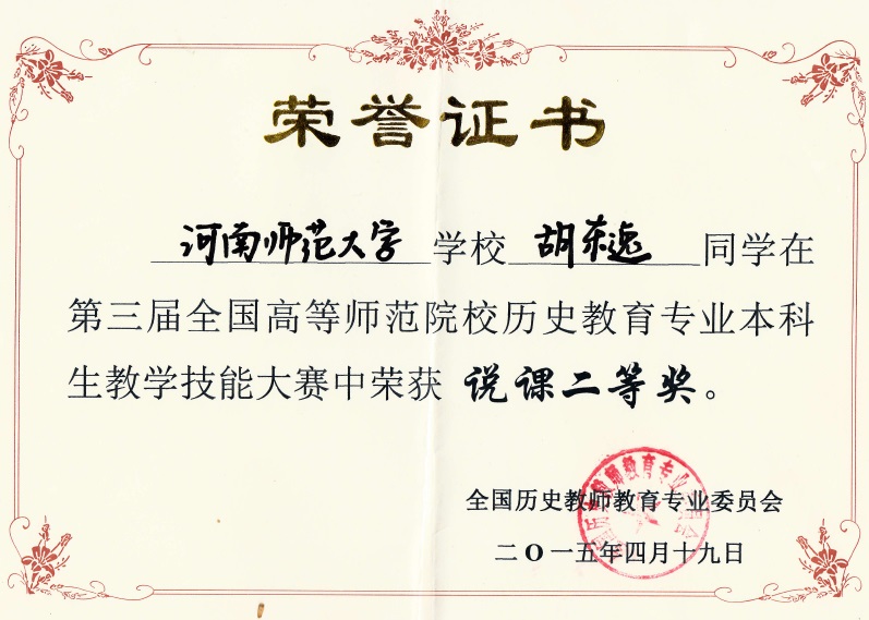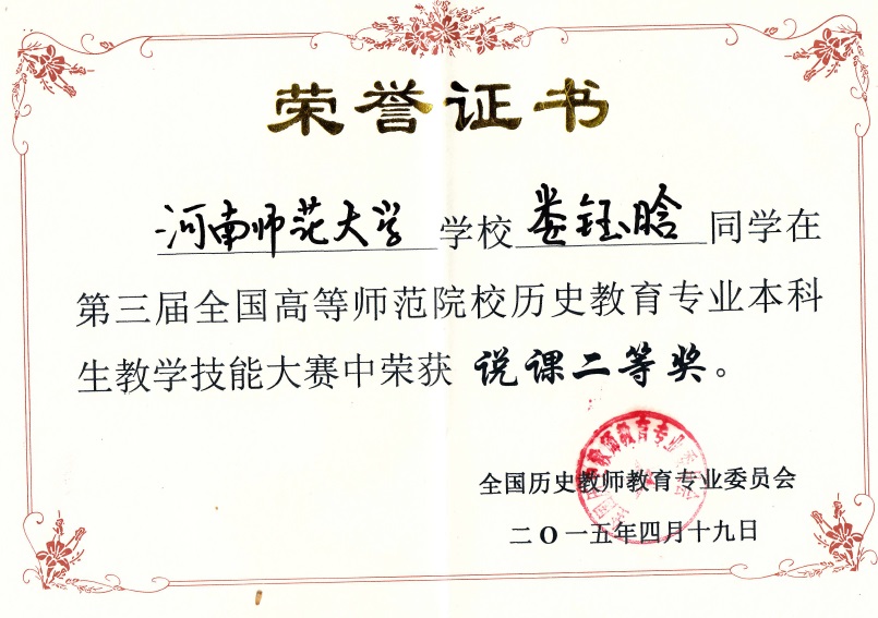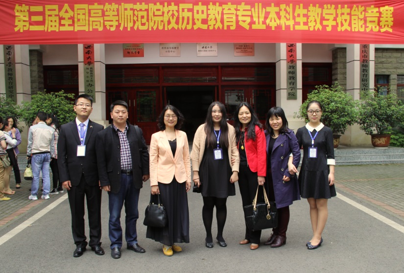 2015年4月17至19日,第三届全国高等师范院校历史教育专业本科生教学技能大赛在西南大学举行。我院选派3名学生参加了此次大赛,在牛琳、马小能老师的悉心指导下,经过激烈角逐,2人获得二等奖、1人获得三等奖,其中2011级历史学专业胡东逸、2012级历史学专业娄钰晗分别获得说课二等奖,2012级历史学专业宗尧获得讲课三等奖,我校获得优秀组织奖,马小能老师获得优秀辅导教师奖。院党委书记王霞、副院长鞠明库带队并观摩了此次大赛。