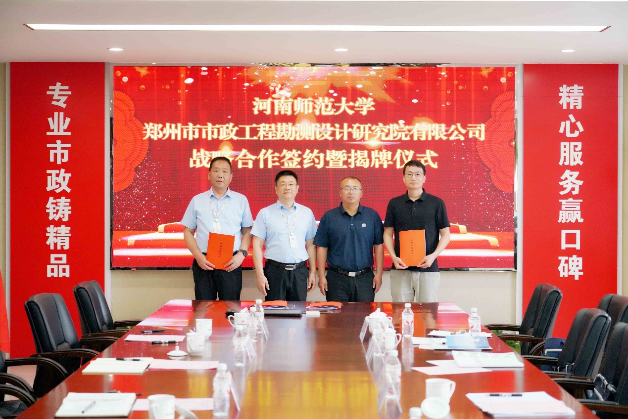 5月22日上午,我院与郑州市政勘测设计研究院有限公司举行战略合作框架协议、河南师范大学专业实习基地签约仪式。郑州市市政工程勘测设计研究院有限公司党委书记、董事长、总经理乔建伟,副总经理王亮、崔亚新,环境学院党委副书记苗山根、副院长闫旭等领导,以及双方相关职能部门负责人参加此次活动。